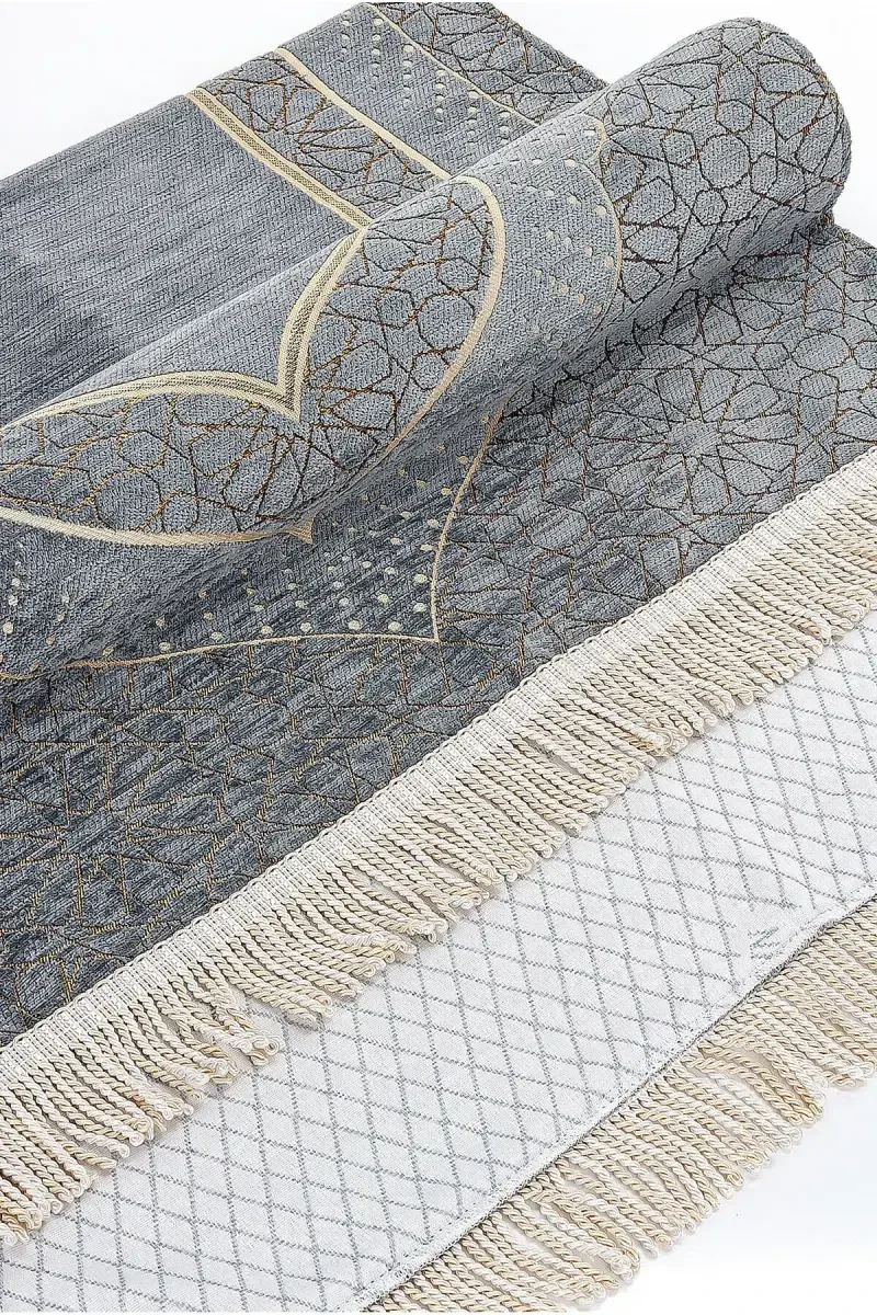 Mihrap Patterned Lined Chenille Prayer Rug - Gray-Gray, has a special design that combines elegance and comfort. Thanks to its high-quality chenille fabric, it offers a soft touch, while its elegant mihrap pattern helps to add peace to your worship. Its lined structure increases the durability of the prayer rug and also prevents cold from the floor. The harmony of gray and gray tones allows it to adapt easily to all kinds of decorations. Its lightweight and portability makes it easy to use at home, while traveling, or in the mosque. It is an ideal choice for those who seek both comfort and aesthetics while praying.