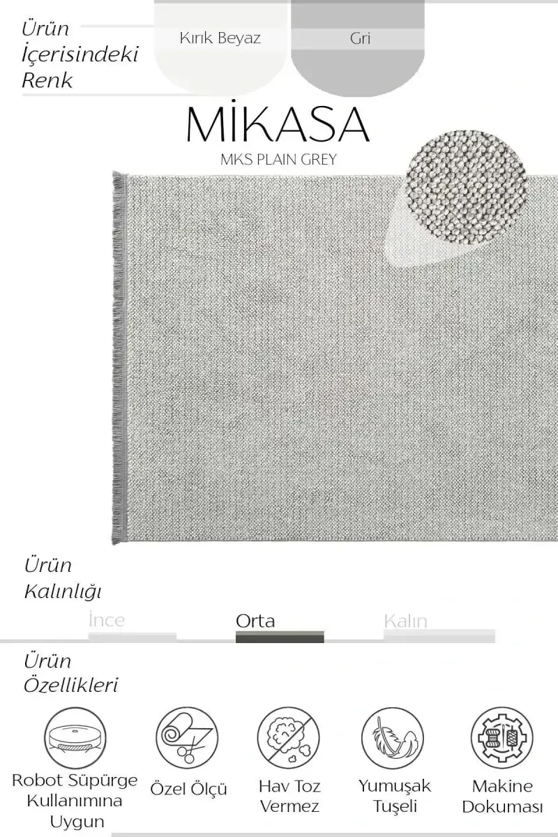 Mikasa Mks Plain Gri halı, modern yaşam alanlarınız için tasarlanmış, şıklığı ve konforu bir araya getiren mükemmel bir seçenektir. Yumuşak dokusuyla ayaklarınıza nazik bir dokunuş sunarken, gri rengiyle her türlü dekorasyona kolayca uyum sağlar. Salonunuzdan koridorunuza, yatak odanızdan mutfağınıza kadar evin her köşesinde kullanabileceğiniz bu halı, hem estetik görünümü hem de pratik özellikleriyle ön plana çıkar. Makine dokuması tekniğiyle üretilmiş olup, yüksek kaliteli polyester iplikleri sayesinde uzun ömürlü ve dayanıklıdır. 7 mm hav yüksekliği ve 10 mm halı kalınlığı ile ideal bir denge sunarak, hem konforlu bir zemin oluşturur hem de robot süpürge kullanımına uygundur. Özel ölçü seçenekleriyle de sunulan Mikasa Mks Plain Gri halı, evinize özel çözümler sunar. Hav toz vermez özelliği sayesinde alerjisi olanlar için de idealdir. Orta kalınlıkta olması, mevsim geçişlerinde ve farklı zeminlerde rahatlıkla kullanılabilmesini sağlar. Yumuşak tuşesi ve modern tasarımıyla evinizin atmosferini zenginleştirirken, kolay temizlenebilir özelliği sayesinde de size zaman kazandırır. Mikasa Mks Plain Gri halı, sadece bir halı değil, aynı zamanda yaşam alanlarınıza değer katan bir detaydır. Cool Halı güvencesiyle sunulan bu ürünü tercih ederek, kaliteyi ve şıklığı bir arada yaşayın. Türkiye'de üretilmiştir, bu da yerli üretime destek olmanın gururunu yaşatır. İster kesme yolluk olarak, ister standart halı ölçülerinde, Mikasa Mks Plain Gri halı ile evinizde sıcak ve davetkar bir ortam yaratın.