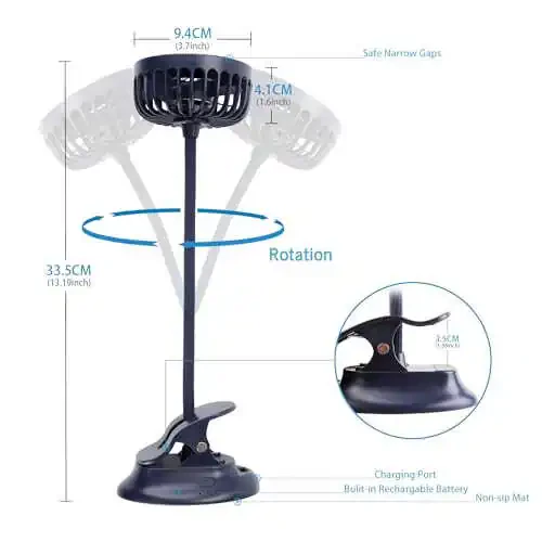 【Unique Power Bank Function】 Your phone is dead? Take it easy! Designed with a 5V/1A USB output port, the mini usb clip fan not only can cool you down, also can be used as a emergency power to charge your phone, GPS, MP3 or iPod, etc. when you go camping or traveling. You'll never feel embarrassed. 【Flexible & Multi-functional】 About 13'' flexible and bendable hose bracket supports manual vertical or horizontal flip to keep you enjoy the cool wind at every angle. With super strong clamp and compact size, it can be put in bag and taken everywhere, perfect for baby stroller, home, office, dormitory, laptop, gym workout, car backseat, outdoors, camping, trips etc. 【Superior Stability & Reliability】 Superior quality PP material makes our personal electric fan base has good bearing capacity. Plus bottom non-slip silicone design it's more stable. Adopting a dense net cover, it can effectively reduce the risk of children touching the fan blade. 【Multiple Power Supply Options】 Built-in rechargeable battery makes the small clip on fan can be charged everywhere, very convenient to get recharge with cellphone adapter, power bank, car charger, laptop etc. Great gift for mother, father or friends. 【Three Speed & Low Decibel】 With on/off rotary button, you can adjust the desktop fan to the most comfortable wind speed. Extreme soft natural wind makes your feel snuggly under scorching sun. Feel free to enjoy reading, sleeping without the noise bothering you.