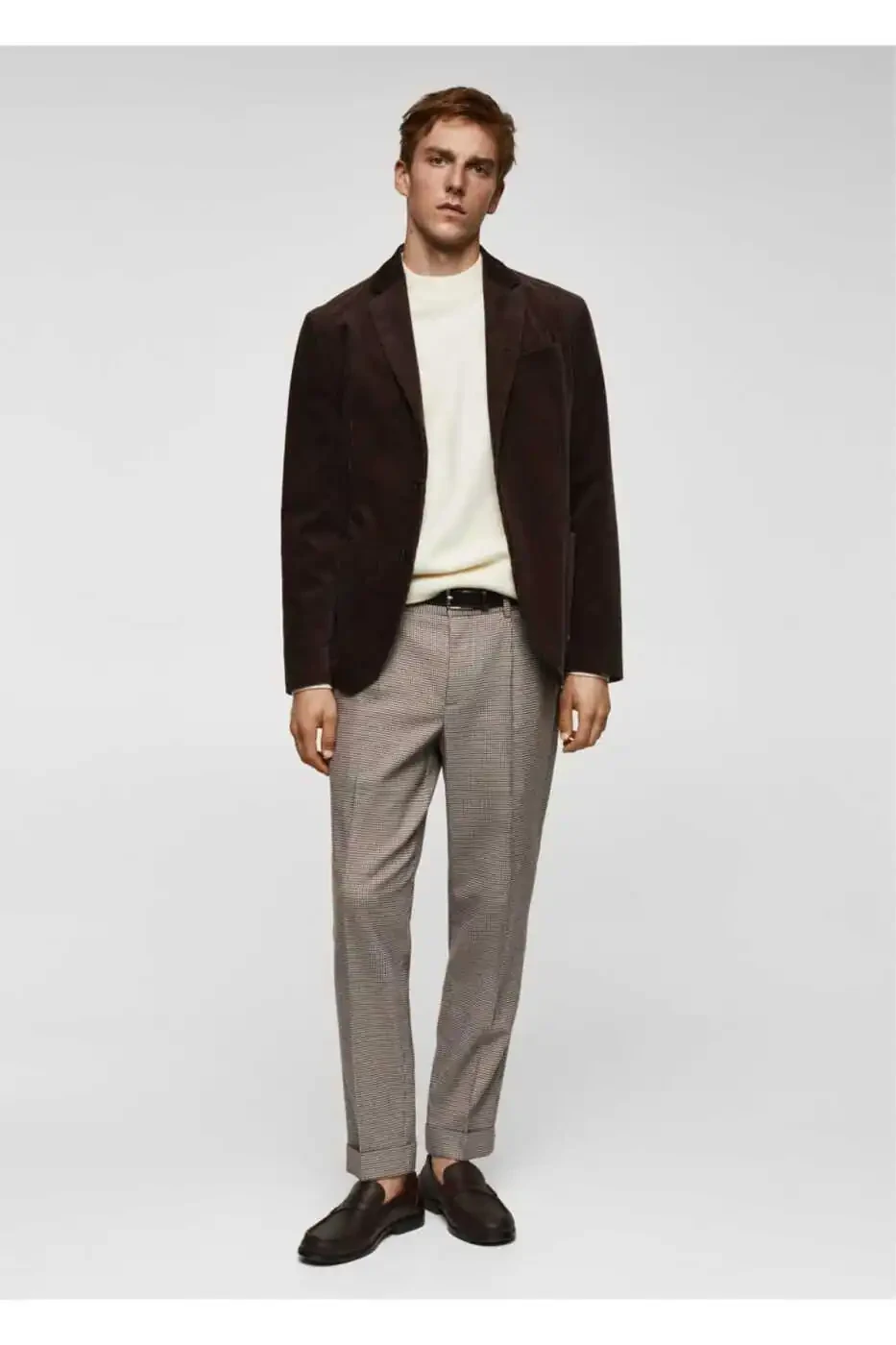 These slim-fit pants are made of a micro houndstooth wool blend. They are zippered and buttoned, have a buttonhole detail on the front, and have ironed tape details on the front and back. The pants have two front pockets and two back patch pockets. Their hems are cuffed.