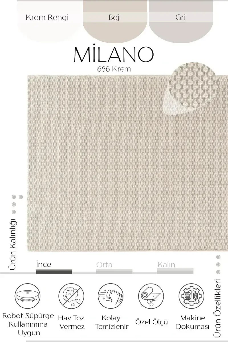 Milano 666 Krem Hasır Dokulu Halı ile evinizin atmosferini yenileyin! Bu halı, sadece bir zemin kaplaması olmanın ötesinde, yaşam alanlarınıza sıcaklık, konfor ve estetik bir dokunuş katmayı hedefler. Krem renginin zarif tonu, her türlü mobilya ve dekorasyon stiliyle mükemmel bir uyum sağlayarak, mekanınıza aydınlık ve ferah bir hava katar. Hasır dokusu ise, halıya doğal ve otantik bir görünüm kazandırırken, ayaklarınızın altında hoş bir his bırakır.Salonunuzda, misafirlerinizi ağırlarken şık ve davetkar bir ortam yaratmak, mutfağınızda yemek hazırlarken konforlu bir zemin sunmak, koridorunuzda veya yolluk olarak kullanıldığında ise evinize sıcak bir karşılama sunmak için idealdir. Makine dokuması sayesinde yüksek kaliteli ve dayanıklı bir yapıya sahip olan bu halı, uzun yıllar boyunca ilk günkü güzelliğini korur.Ev hanımlarının ve dekorasyon tutkunlarının beğenisini kazanan Milano 666, kolay temizlenebilir özelliği sayesinde de pratik bir kullanım sunar. Günlük kullanımda oluşan kir ve lekeleri kolayca temizleyebilir, halınızın her zaman temiz ve bakımlı görünmesini sağlayabilirsiniz. Hem estetik hem de fonksiyonel özellikleriyle öne çıkan bu halı, evinizin vazgeçilmez bir parçası olmaya adaydır.Milano 666 ile sadece bir halı değil, aynı zamanda evinize değer katan bir yatırım yaparsınız. Krem renginin sıcaklığı, hasır dokusunun doğallığı ve makine dokumasının dayanıklılığı bir araya gelerek, size uzun yıllar boyunca keyifle kullanacağınız bir ürün sunar. Ev dekorasyonunda fark yaratmak ve yaşam alanlarınıza kişisel bir dokunuş katmak isteyenler için Milano 666 Krem Hasır Dokulu Halı, mükemmel bir seçimdir. Üstelik, farklı boyut seçenekleri sayesinde, ihtiyacınıza uygun ebatlarda tercih edebilir, evinizin her köşesine uyum sağlayacak bir halı bulabilirsiniz. Milano 666 ile evinizde sıcak, şık ve davetkar bir atmosfer yaratmanın keyfini çıkarın.