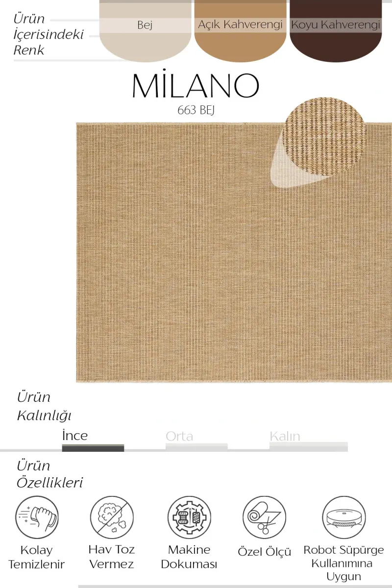 Milano Bej Hasır Görünümlü Bohem Rustik Makina Dokuma Kolay Temizlenir Kesme İnce Salon Oda Halısı-Bej 33