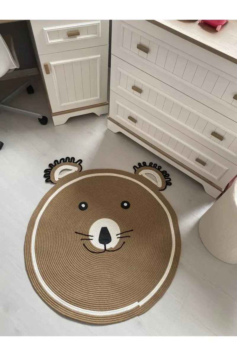 Jüt halı, çocuk odası halısı, bebek halısı, antialerjik halı, toz vermez halı, ayı figürlü halı, doğal halı, kahverengi halı, Milda halı, jüt dokuma halı