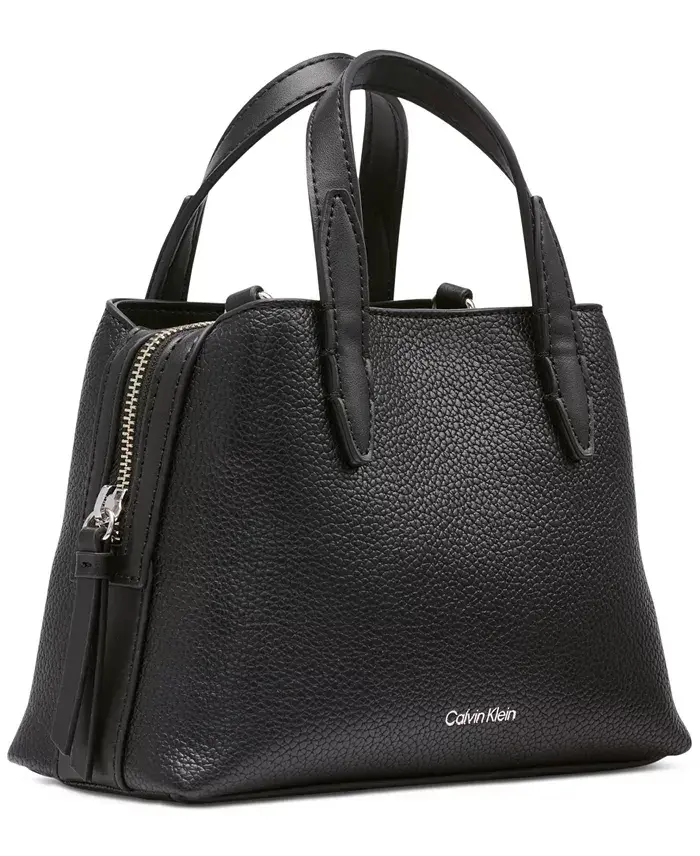 Easily complimenting every outfit, the Millie Small Faux Leather Crossbody by Calvin Klein is a perfect versatile companion. Small sized bag; 9"W x 6"H x 4"D (width is measured across the bottom of the bag); 1.5 lbs. approx. weight Silhouette is based off 5'9" model 23"L removable, adjustable webbed crossbody strap Magnetic snap& zipper closures Silver-tone hardware Triple compartment interior with zip & slip pockets Polyurethane; lining: polyester Spot clean Imported