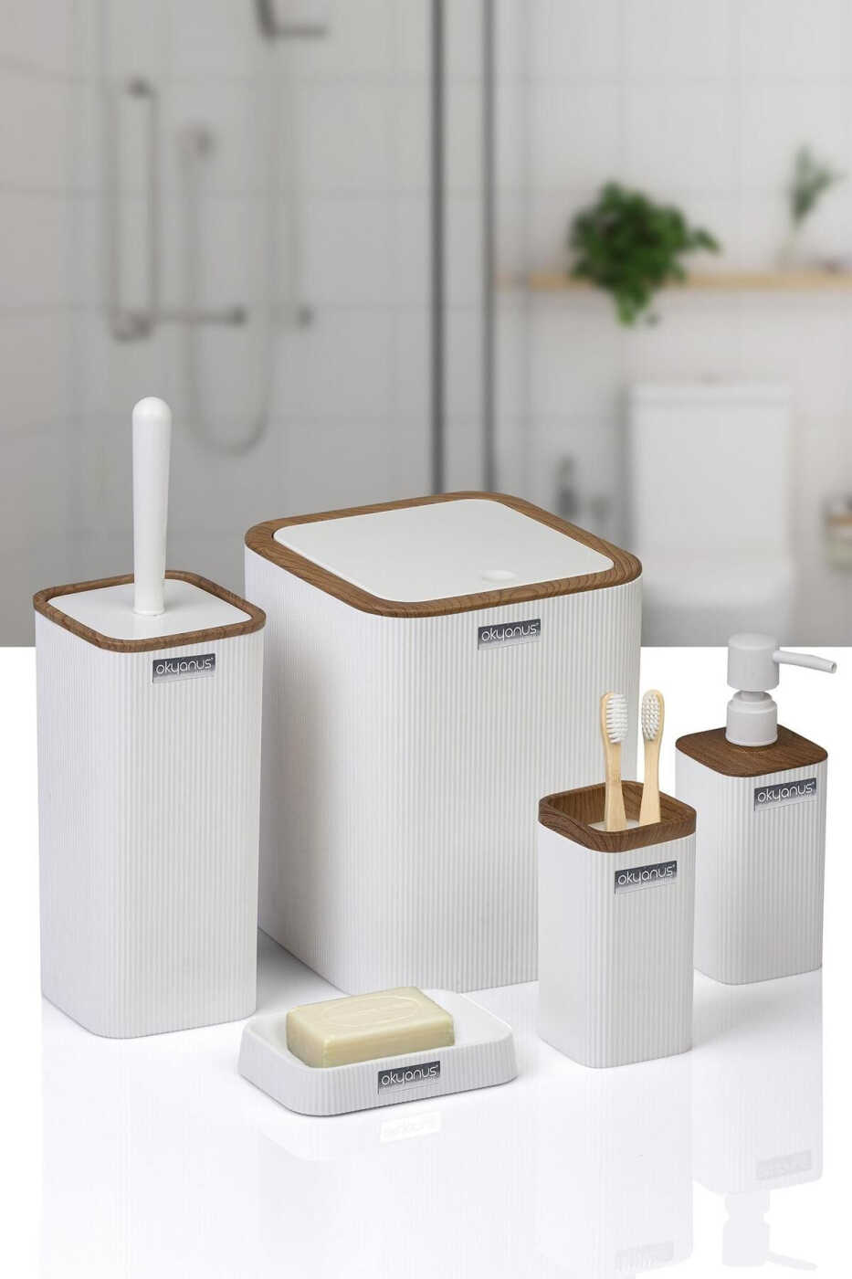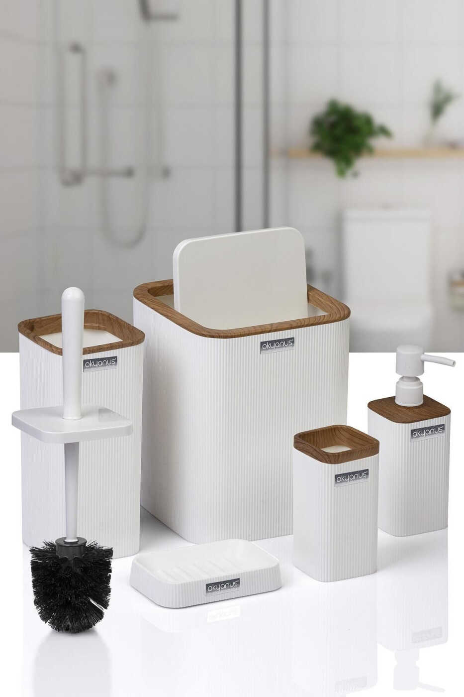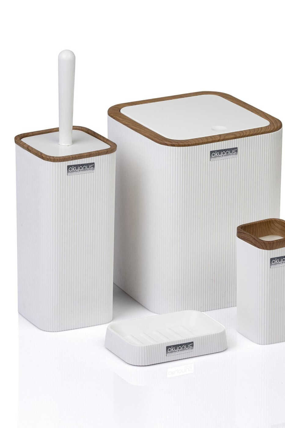Mina Beyaz Ahşap Desenli Çizgili Kare 5'li Banyo Seti-Beyaz Kare Ahşap Mina