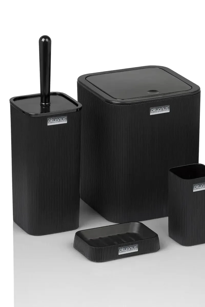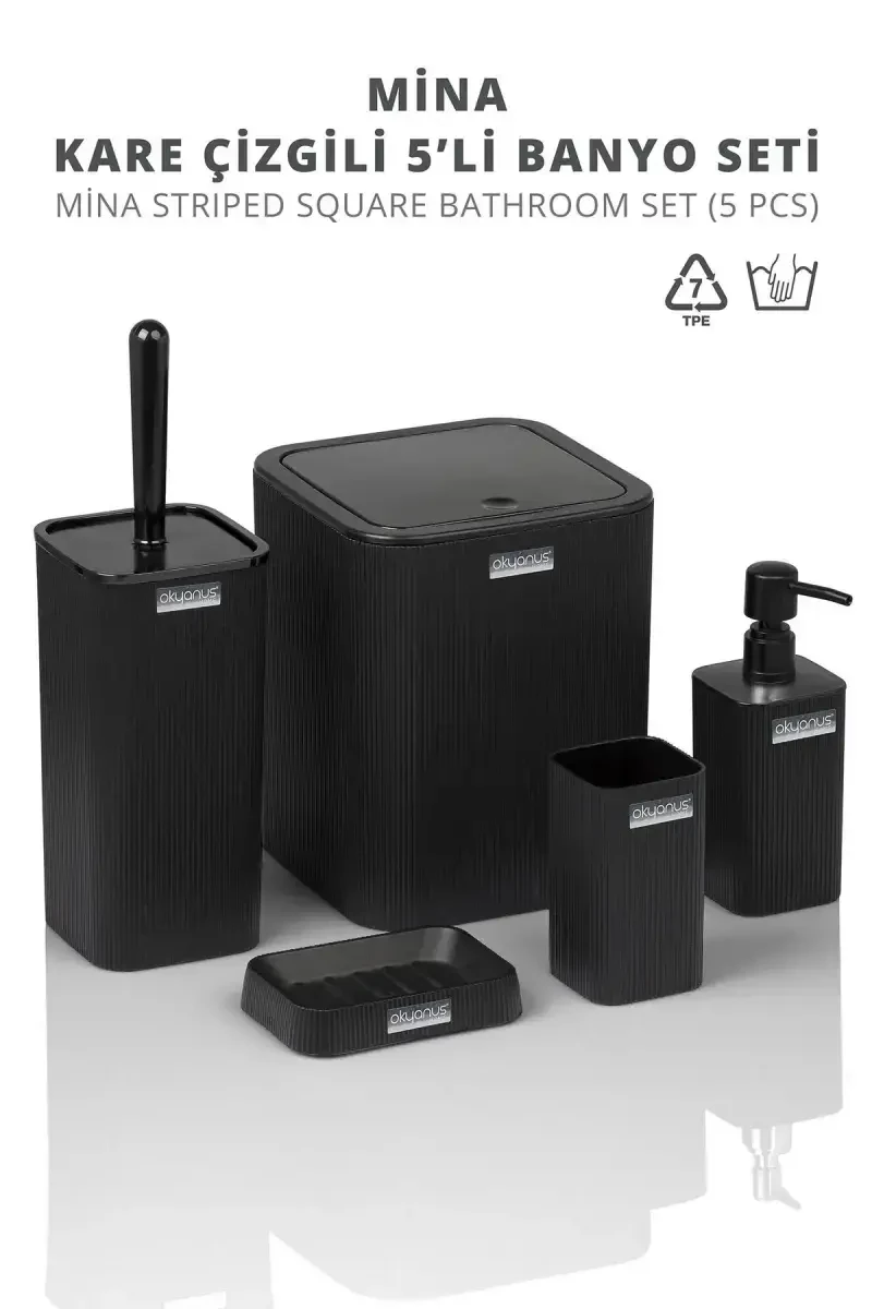 Mina Black Striped Square Bathroom Set is designed to add a modern and stylish touch to your bathroom. The set includes a liquid soap dispenser, toothbrush holder, soap dish, and toilet brush. Its black color and square shape add a sophisticated atmosphere to your bathroom. Made of durable material, it offers long-lasting use. It has an easy-to-clean surface.Product DescriptionAchieve both order and an aesthetic look in your bathroom with the Mina Black Striped Square Bathroom Set. This stylish and useful bathroom set will completely change the atmosphere of your bathroom by combining modern design and functionality. This set, which combines the elegance of black with geometric lines, adds a sophisticated touch to your bathroom while facilitating your daily use. Each piece in the set is carefully designed to meet the needs of your bathroom. The liquid soap dispenser, toothbrush holder, soap dish, and toilet brush help you create a hygienic and orderly environment in your bathroom.The timeless elegance of black color combines with the modern lines of the square form, adding a minimalist and contemporary atmosphere to your bathroom. The durable material of the bathroom set offers long-lasting use, while its easy-to-clean surface ensures a hygienic usage experience. Each piece is designed to match your bathroom's decoration and complements the overall aesthetic of your bathroom. The Mina Black Striped Square Bathroom Set is not only a functional product but also a decorative element that enhances the visual appeal of your bathroom. If you want to create a modern and stylish atmosphere in your bathroom, maintain order, and have a hygienic usage experience, the Mina Black Striped Square Bathroom Set is for you. With this set, you can find both aesthetics and usability together in your bathroom.Product Features* Color: Black* Form: Square* Set Contents: Liquid Soap Dispenser, Toothbrush Holder, Soap Dish, Toilet Brush* Material: Durable material* Cleaning: Easy-to-clean surface* Design: Modern and stylish designAdditional InformationThe product easily adapts to your bathroom's decoration. It creates a hygienic environment in your bathroom with its long-lasting and useful structure. It adds value to your bathroom with its stylish design.