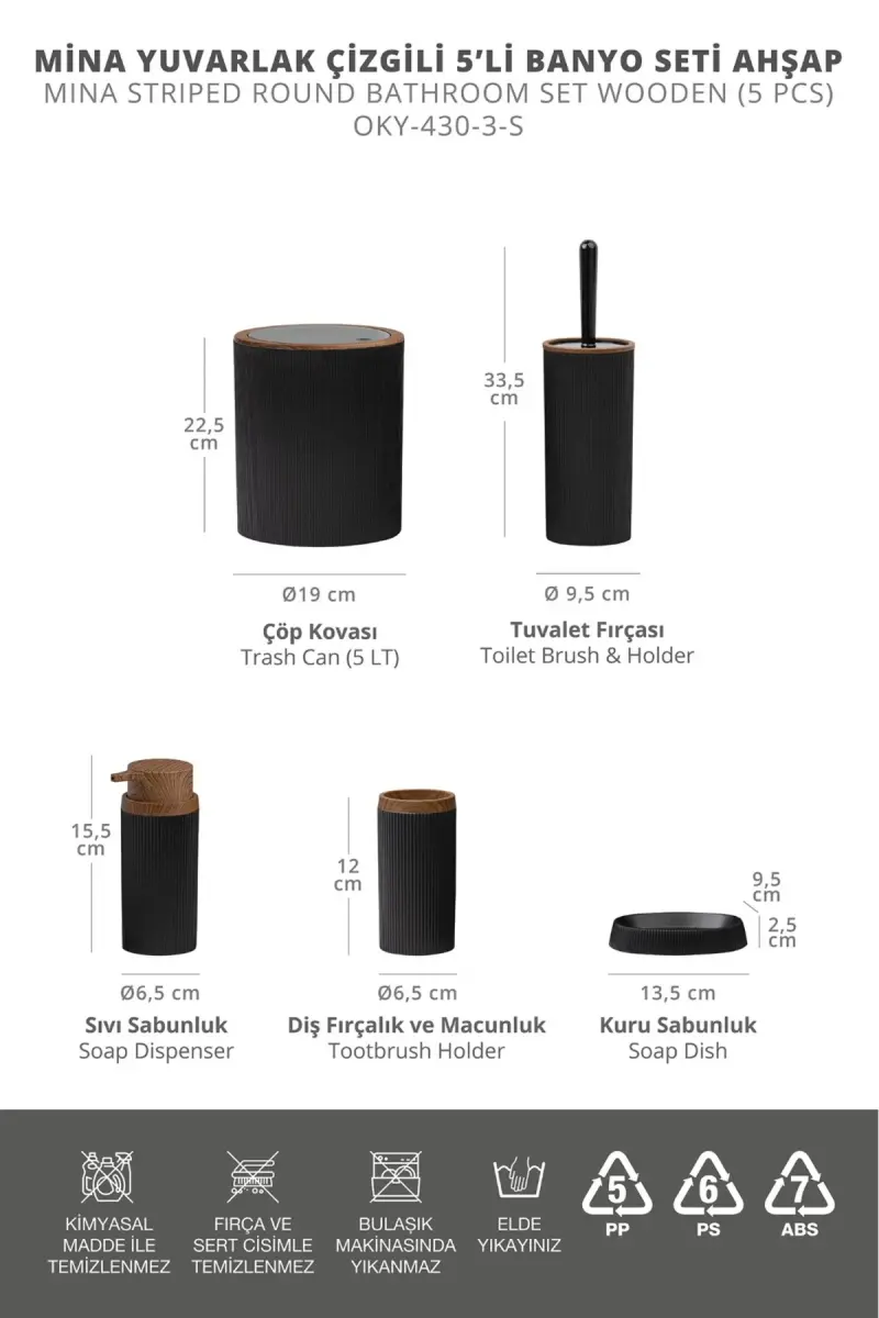 Banyonuza modern ve şık bir dokunuş katacak Mina Siyah Ahşap Desenli Çizgili Yuvarlak 5'li Banyo Seti ile tanışın! Okyanus Home güvencesiyle sunulan bu zarif set, banyonuzun atmosferini anında değiştirecek. Siyahın asaleti ve ahşap deseninin sıcaklığının mükemmel uyumunu yakalayan bu set, çizgili tasarımıyla da göz alıcı bir görünüm sergiliyor. Dayanıklı ve kaliteli malzemelerden üretilen Mina Banyo Seti, uzun yıllar boyunca banyonuzun vazgeçilmezi olacak.Bu 5 parçalı set, tüm banyo ihtiyaçlarınızı karşılamak için özenle tasarlandı. Şık bir sabunluk, diş fırçası bardağı, sıvı sabunluk, tuvalet fırçası ve çöp kovasından oluşan set, banyonuzda düzen ve estetiği bir araya getiriyor. Yuvarlak hatları ve ahşap desenli detaylarıyla her banyo dekorasyonuna uyum sağlayan bu set, banyonuza lüks bir hava katacak.Mina Siyah Ahşap Desenli Çizgili Yuvarlak 5'li Banyo Seti, sadece şıklığıyla değil, aynı zamanda pratikliğiyle de öne çıkıyor. Kolay temizlenebilir yapısı sayesinde hijyeni korumanıza yardımcı olurken, dayanıklı malzemesi uzun süreli kullanım imkanı sunar. Banyonuzda hem şıklığı hem de fonksiyonelliği arayanlar için ideal bir seçim olan bu set, kendinize veya sevdiklerinize özel bir hediye alternatifi de olabilir. Üstelik, Trendyol'da kampanyalı fiyatlarla satışa sunulan bu üründen 100 adetten fazla stok mevcut. Kaçırılmayacak bu fırsatı değerlendirin ve banyonuzu Mina Banyo Seti ile güzelleştirin!