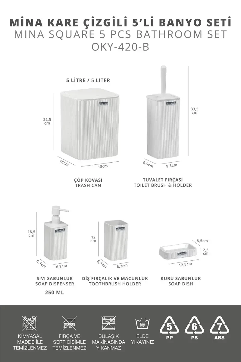 This product is a perfect option that offers the elegance and functionality you need in your bathroom. Thanks to its durable material and modern design, you can use it for many years. Its easy-to-clean feature eliminates the need to worry about hygiene. With its stylish and minimalist design that will suit every bathroom, the Mina White Striped Square Bathroom Set will be an indispensable part of your bathroom.