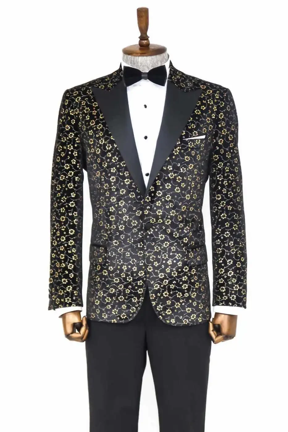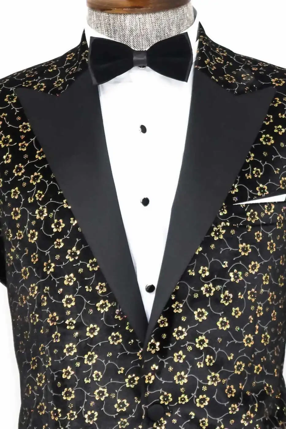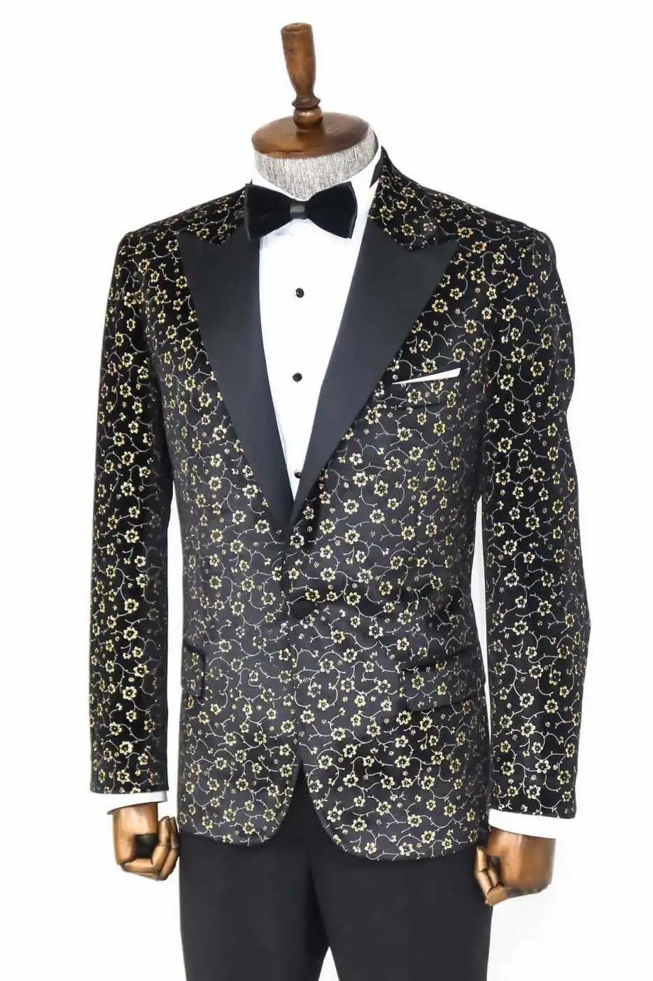 Mini Çiçek Desenli Siyah Erkek Smokin Ceket - Wessi