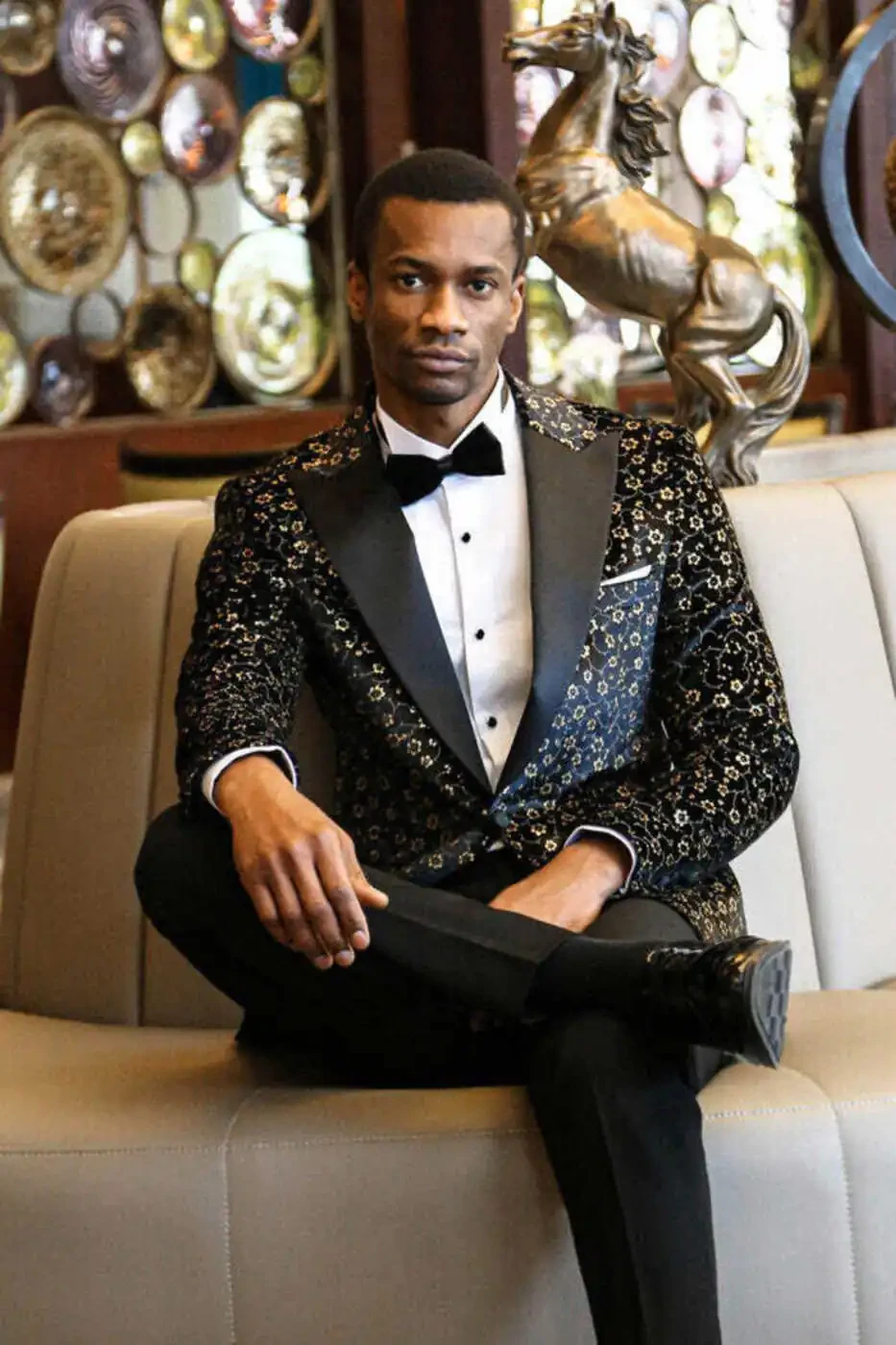 men's tuxedo, black tuxedo, floral tuxedo, mini floral tuxedo, Wessi, tuxedo jacket, special occasions, stylish clothing, classic tuxedo, modern tuxedo
