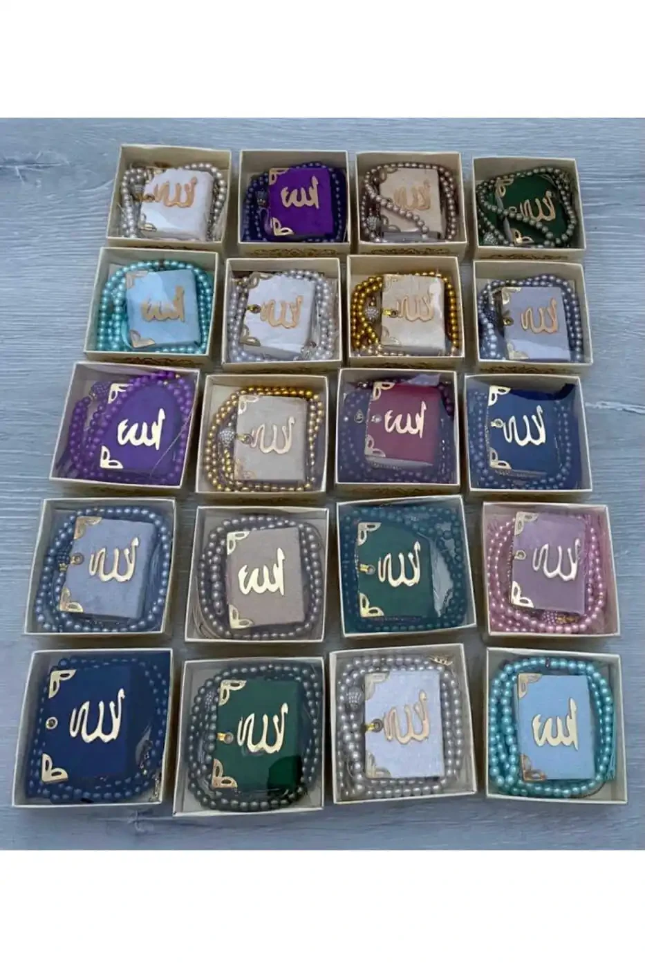 Bizning 20 ming so‘mlik sovg‘a qutisiga o‘ralgan mini Qur’oni Karim va tasbeh to‘plamimiz turli xil xil ranglarda taqdim etiladi. To‘plamda joylashgan mini Qur’oni Karim o‘zining zamonaviy va nafis dizayni bilan ajralib turadi. Kichkina o‘lchami tufayli uni har doim o‘zingiz bilan olib yurishingiz va osonlik bilan o‘qishingiz mumkin. Tasbeh ham xuddi shunday ehtiyotkorlik bilan tanlab olingan va sifatli materiallardan tayyorlangan. Aralash rangdagi variantlari bilan har qanday didga mos keladigan ushbu to‘plamni yaqinlaringizga ham ajoyib sovg‘a sifatida berishingiz mumkin.