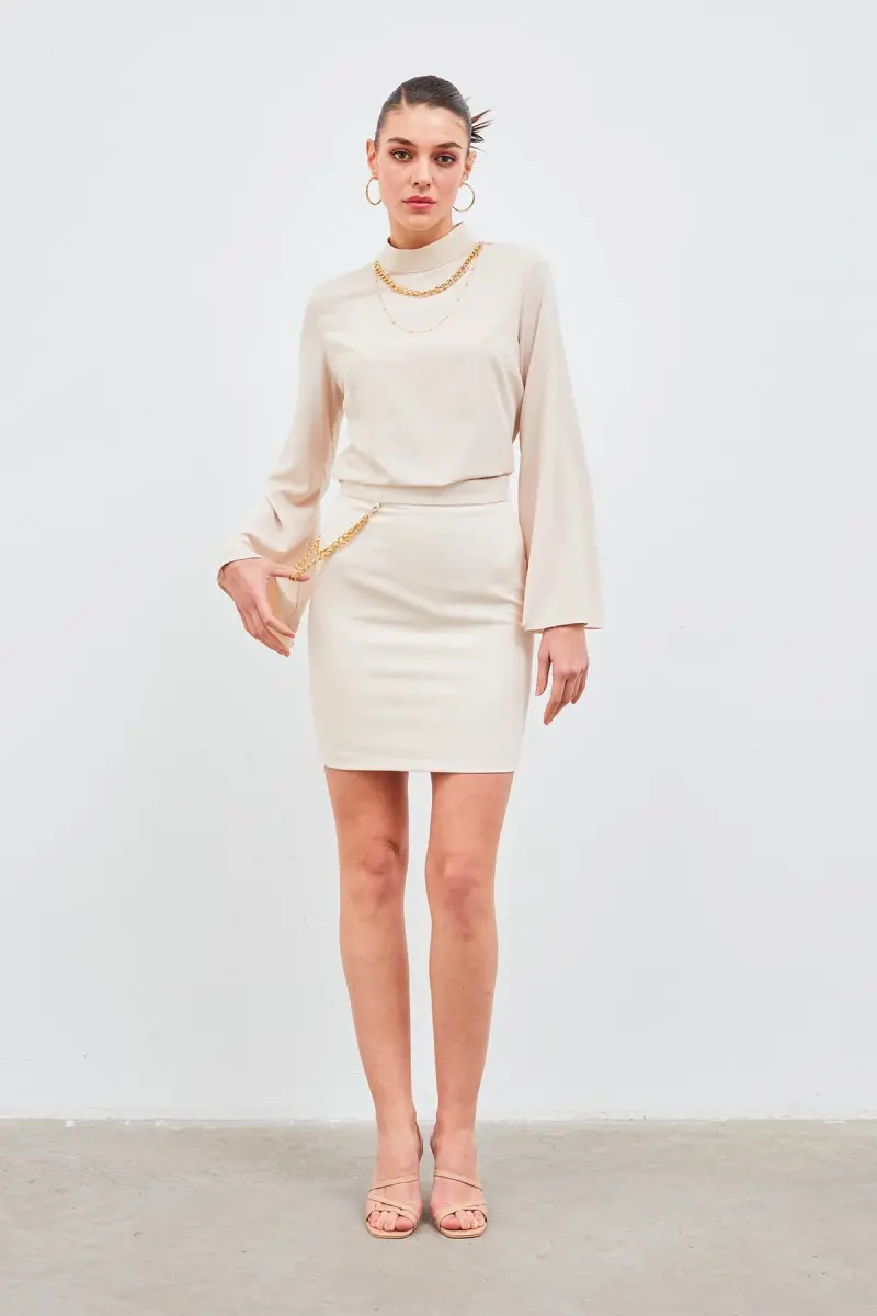 The Mini Skirt with Chain Accessory is a perfect choice to add a touch of elegance to your everyday style. Its sophisticated design makes it stand out. The beige color complements every combination, bringing together practicality and elegance for everyday use.