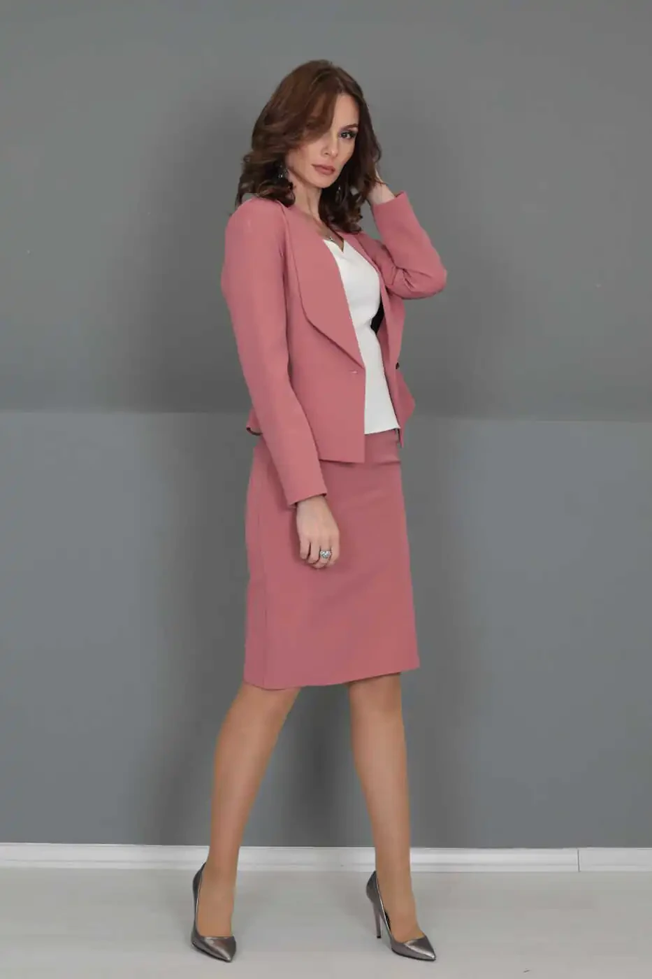Идеальный выбор для создания изящного и стильного образа, мини-жакет и юбка-карандаш подойдут как для особых случаев, так и для повседневной жизни. Розовый кварц придает наряду женственность, комфорт и элегантность.