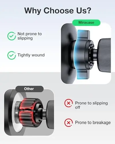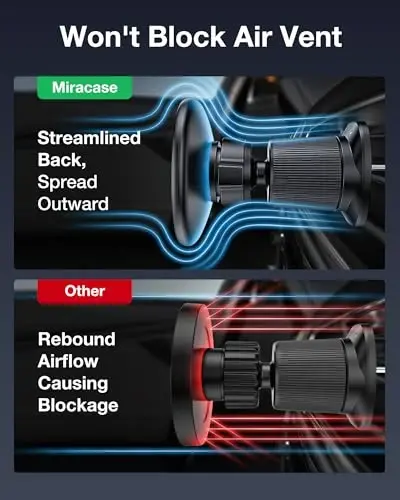 2026 Designed for Magsafe:Miracase phone holder for car Designed for iphone 17/16/15/14/13/12 Pro Max Mini and official Magsafe cases and other magnetic phone cases, this premium iPhone car mount attaches seamlessly to these phones and experience the convenience of direct magnetic mounting without the need for a metal plate. The included metal ring can be used on cases and other phones without magsafe.𝗡𝗼𝘁𝗲: 𝗧𝗵𝗶𝘀 𝗰𝗮𝗿 𝗺𝗼𝘂𝗻𝘁 𝗱𝗼𝗲𝘀 𝗻𝗼𝘁 𝘀𝘂𝗽𝗽𝗼𝗿𝘁 𝘄𝗶𝗿𝗲𝗹𝗲𝘀𝘀 𝗰𝗵𝗮𝗿𝗴𝗶𝗻𝗴. Never Fall Off-Metal Hook Design:Miracase car phone holder adopts simplified locking design. The steel metal hook(with silicone pad and mat) will catch one of car air vent blades and provide excellent strudiness. It will work well for your car even in extremely harsh environments. NOTE: ONLY Compatible with horizontal and vertical vents. Not suitable for round vents. Also can be used on bedstand and desk. Universal Compatibility:Miracase cell phone stand for car mount is compatible with iPhone 17, 17 pro, 17 pro max, iPhone 16, 16 pro, 16 pro max, iPhone 15, 15 Pro, 15 Pro Max, 15 Plus,14, 14 Pro, 14 Pro Max, 14 Plus, iPhone 13, 13 Pro, 13 Pro Max, 13 Mini, iPhone 12, 12 Pro, 12 Pro Max, 12 Mini & for MagSafe cases.Vent Compatibility,: Specifically designed for horizontal and vertical slatted vents in most vehicles. Not compatible with circular vents 【360°Adjustable Viewing】 Experience ultimate flexibility! The magnetic phone holder for car features a precision ball-and-socket joint, allowing you to effortlessly rotate your smartphone 360° horizontally and vertically. Easily achieve the perfect, glare-free viewing angle for optimal visibility. The strongest magne connection enables secure one-handed pickup and placement, keeping your focus on the road. Enjoy hands-free convenience for safer calls and clearer GPS navigation during your drive. Professional Support: Miracase provide satisfying solutions. Please feel free to contact us for any product issues