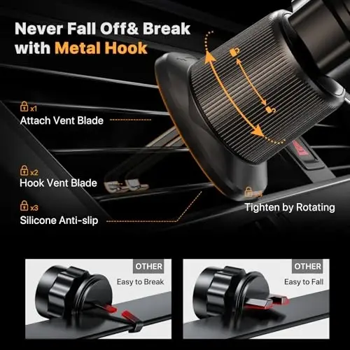 Never Fall Off-Metal Hook Design: Miracase car phone holder adopts simplified locking design. The steel metal hook(with silicone pad and mat) will catch one of car air vent blades and provide excellent strudiness. It will work well for your car even in extremely harsh environments. One-hand Operation: With quick release button, adjustable clamp arms and foot, Miracase car phone mount makes it very easy to insert and remove your phone with single hand. Provide you with safer driving whether you are talking, navigating, listening to music or charging. Universal Compatibility: Miracase cell phone stand for car mount is compatible with the smartphones (4.0-7.2 inches) and thicker cases. Note!!The lengh of vent clip hook is MAX 1.4inch(3.6cm), it will be compatible with vent blades less than 1.4 inches (3.6 cm. ) wide. Not suitable for Round Vent. 360-degree Flexible Rotation: The 360-degree rotatable design will provide you with the best viewing angle to keep secure driving. You can place your phone in any orientation (landscape, portrait and more), Just enjoy the best drving experience. Professional Support: Please feel free to contact us for any product issues, a satisfying solution is promised forever.