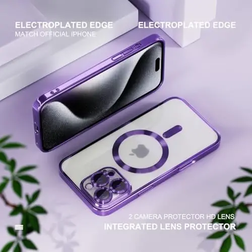 Misea Magnetic for iPhone 16 Pro Case Compatible with MagSafe [Never Yellowing] [Military Grade Drop Protection] Full Camera Lens Protector Plating Soft Clear Phone Case for Women 6.3", Purple