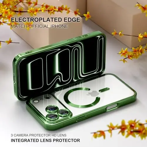 Misea Magnetic for iPhone 17 Pro Max Case Compatible with MagSafe [Never Yellowing] [Military Grade Drop Protection] Full Camera Lens Protector Plating Soft Clear Phone Case for Women, Green