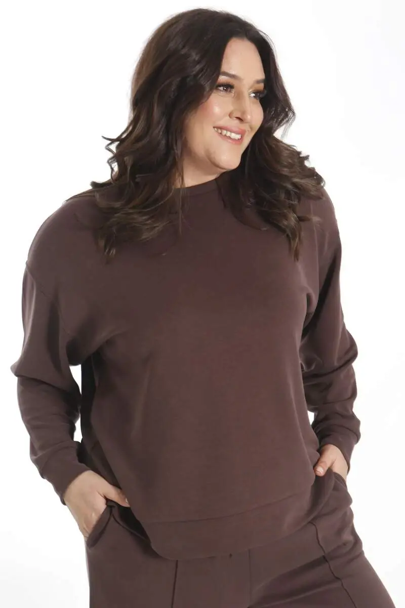 Modal Kumaşlı Yumuşak Dokulu Alt Üst Kahverengi TakımÜrün ÖzellikleriCep ve bağcık detaylı şık bir duruşGözalıcı tasarımı ile havalı görünümYumuşak dokusu ile işlevsel kullanımKalça hizası sweat Pantolon cep detaylıPantolon geniş paçaÜrün AçıklamasıŞık tasarımıyla günlük hayatınızda size konfor sağlayan harika büyük beden Kahverengi eşofman takımı.İster evde dinlenirken ister spor yaparken rahatlıkla kullanabileceğiniz rahat kalıp eşofman takımı.Pamuklu kumaşı ile daha özgür, aktif ve ferah hissedin.Renk: KahverengiMalzeme: %100 PamukManken Ölçüleri: Omuz: 47 cm. - Göğüs: 97 cm. - Basen: 105cm - Bel: 80 cm. - Boy: 1,79 cm. Sweat boy 80 cm. 'dir.Alt Eşofman boy 95 cm. 'dirModel Bedeni: 44