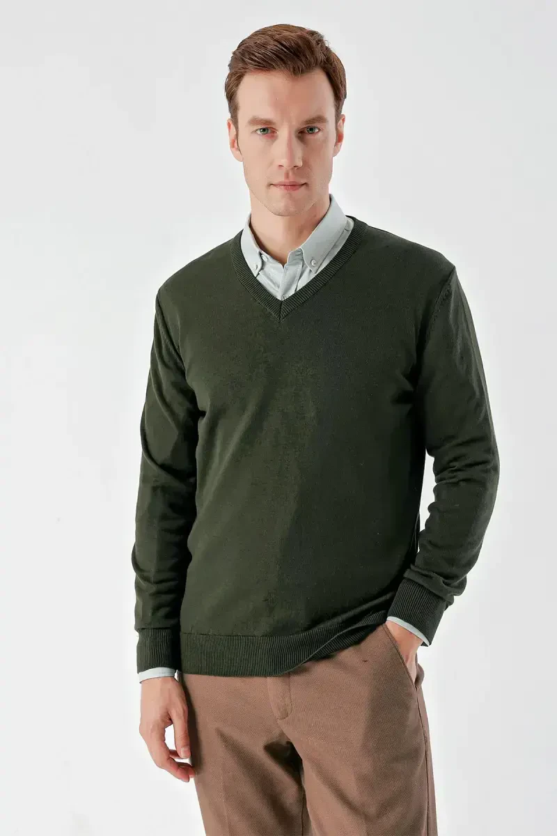 Modazone Haki V Yaka Erkak Triko | Qulay Kesim & Yangi Mavsum