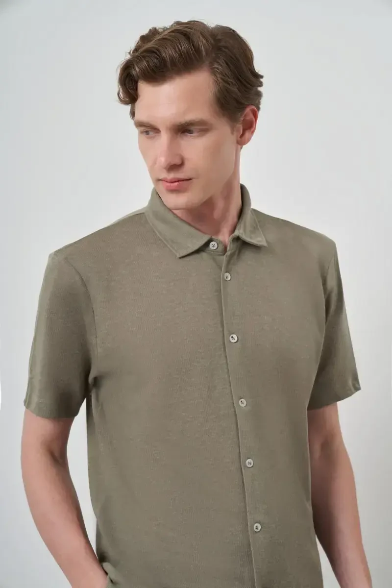 Erkak ko'ylak, xaki ko'ylak, apache yoqa, qisqa yengli, trend ko'ylak, ModaZon, erkaklar modasi, yozgi ko'ylak, qulay ko'ylak, zamonaviy ko'ylak