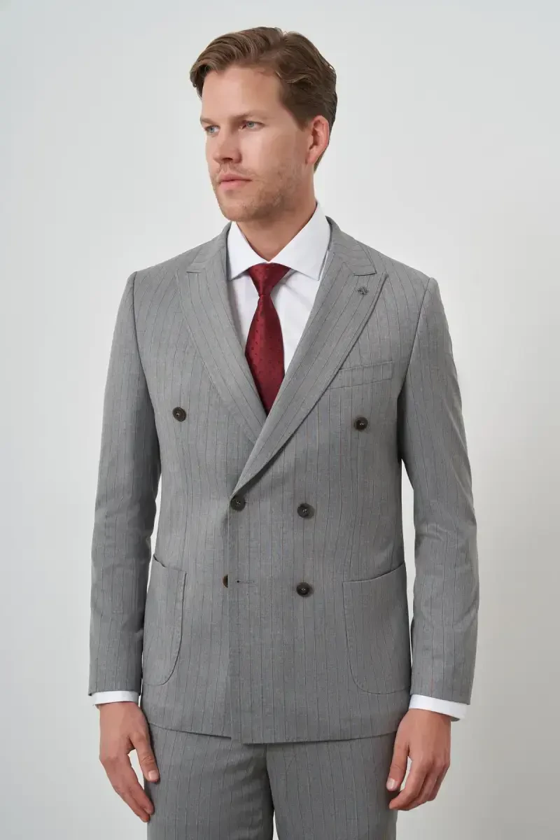 ModaZon Kulrang Ikki Tugmali Erkak Kostyumi | Slim Fit Chiziqli, Trend, Zamonaviy