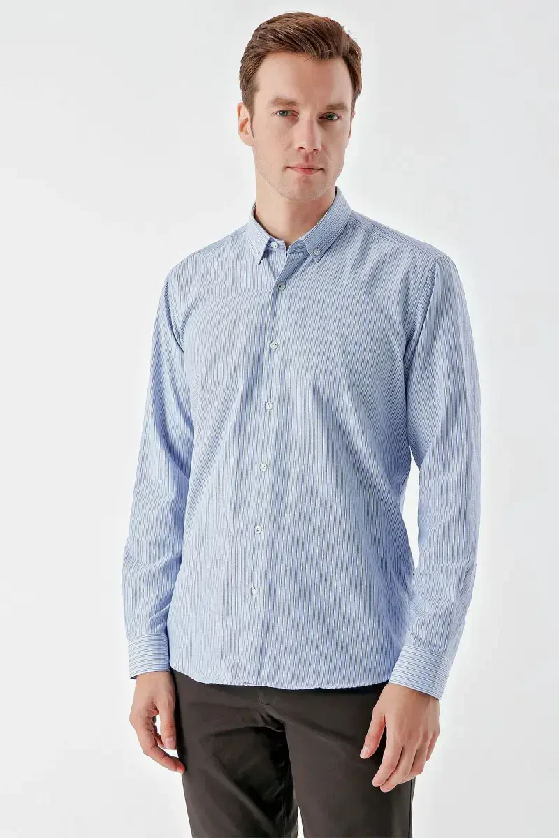 Erkak ko'ylak, ko'k ko'ylak, chiziqli ko'ylak, regular fit, tugmali yoqa, trend ko'ylak, Modazone, paxtali ko'ylak, chiroyli ko'ylak, erkaklar modasi