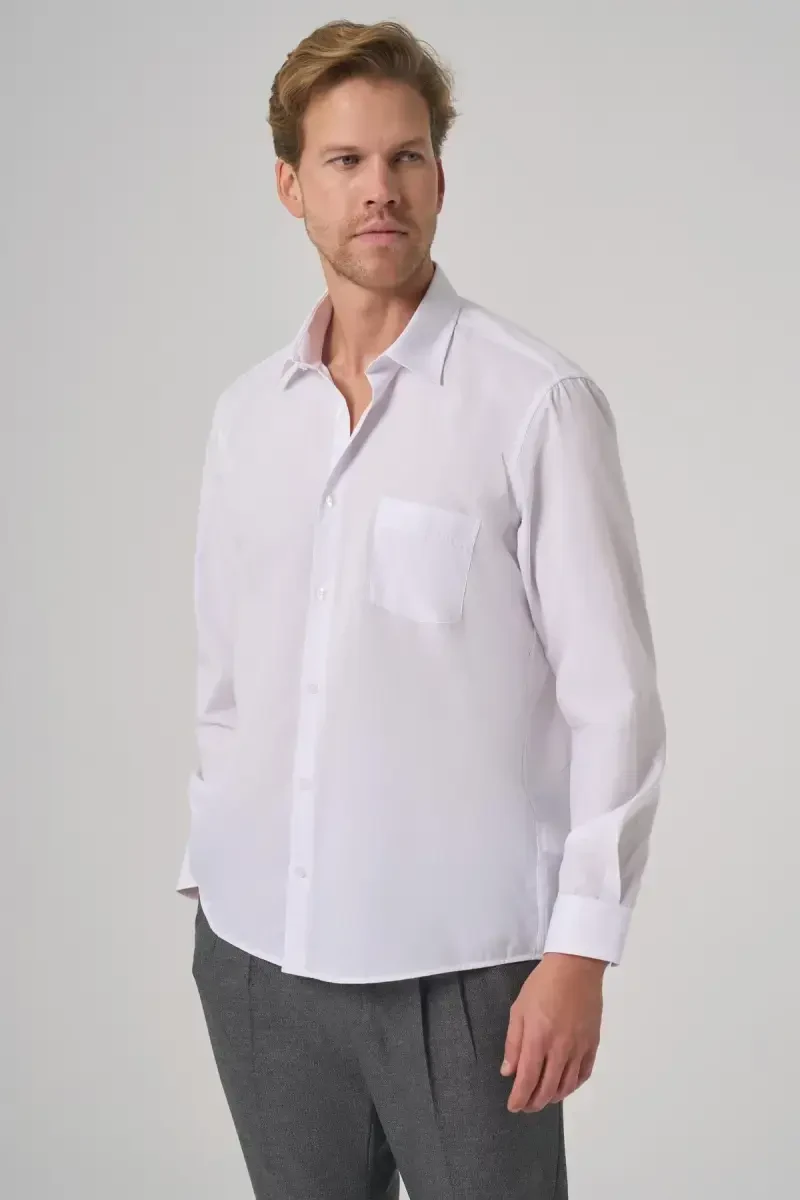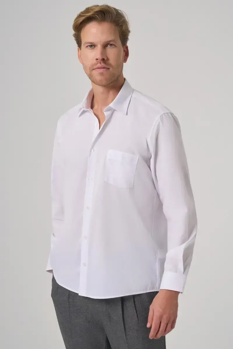 Erkak ko'ylak, oq ko'ylak, regular fit, qattiq yoqa, cho'ntakli ko'ylak, paxta ko'ylak, asosiy ko'ylak, ModaZon, erkaklar kiyimi, chiroyli ko'ylak