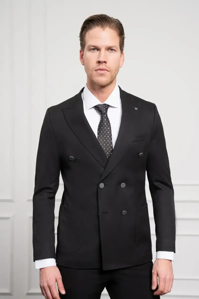 Erkaklar kostyumi, qora kostyum, ikki qatorli kostyum, slim fit kostyum, uchli yoqali kostyum, moda erkaklar, kostyum, erkaklar kiyimi, maxsus kun kostyumi, zamonaviy kostyum
