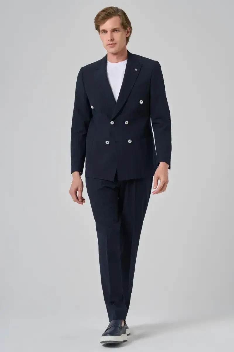 Erkak kostyumi, to'q ko'k kostyum, slim fit kostyum, ikki tugmali kostyum, chiziqli kostyum, poliviskon kostyum, uchli yoqali kostyum, sport kostyumi, ModaZon, zamonaviy kostyum