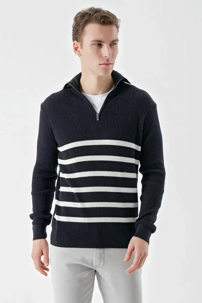 Erkak triko, lacivert triko, chiziqli triko, fermuarli yoqa, tik yoqa triko, dynamic fit, qulay kesim, ModaZ one, erkaklar kiyimi, trend triko