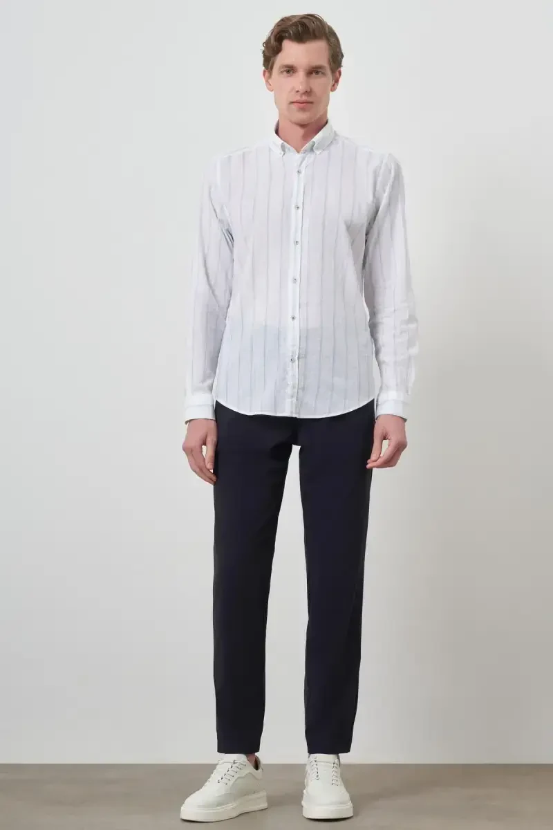 Keten kumaşın doğal yapısı sayesinde nefes alabilen ve serin tutan bir yapıya sahiptir. Makinede yıkanabilir ve kolay ütülenebilir özelliktedir. Dynamic Fit / Slim Fit kalıbı, vücuda oturan ve modern bir görünüm sağlar. Düğmeli yaka detayı, gömleğe klasik bir hava katar. Uzun kollu tasarımı, farklı kombinler için uygunluk sunar.
