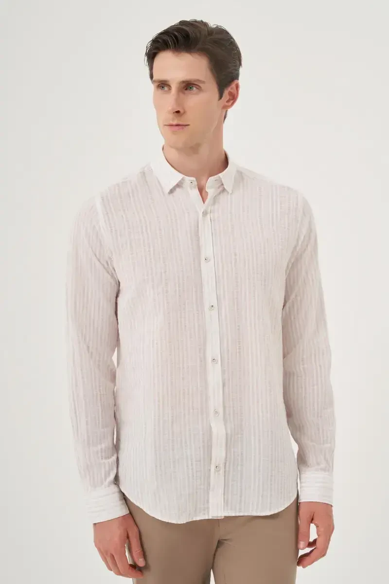 Erkek Bej Keten Gömlek | Trend Fit Britli Yaka - Modazone