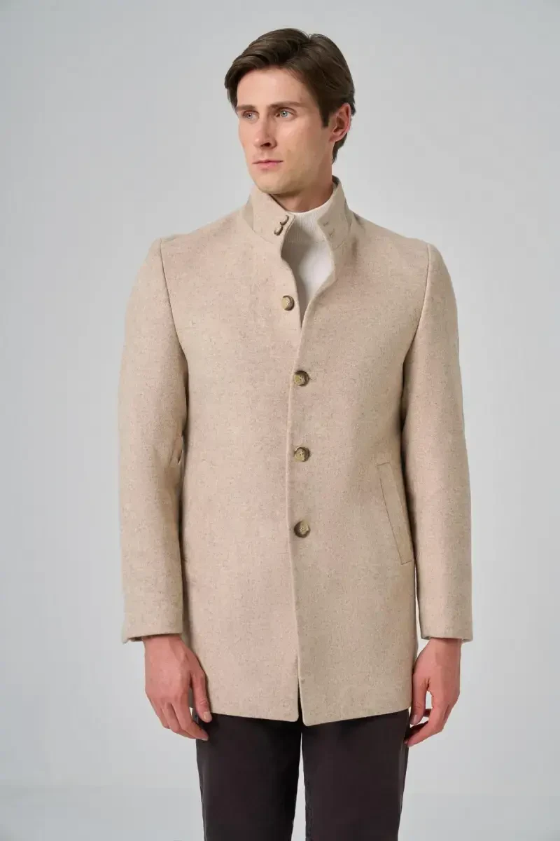 Erkek kaban, yünlü kaban, bej kaban, hakim yaka, dynamic fit, kışlık kaban, ModaZon, erkek giyim, sıcak tutan kaban, şık kaban
