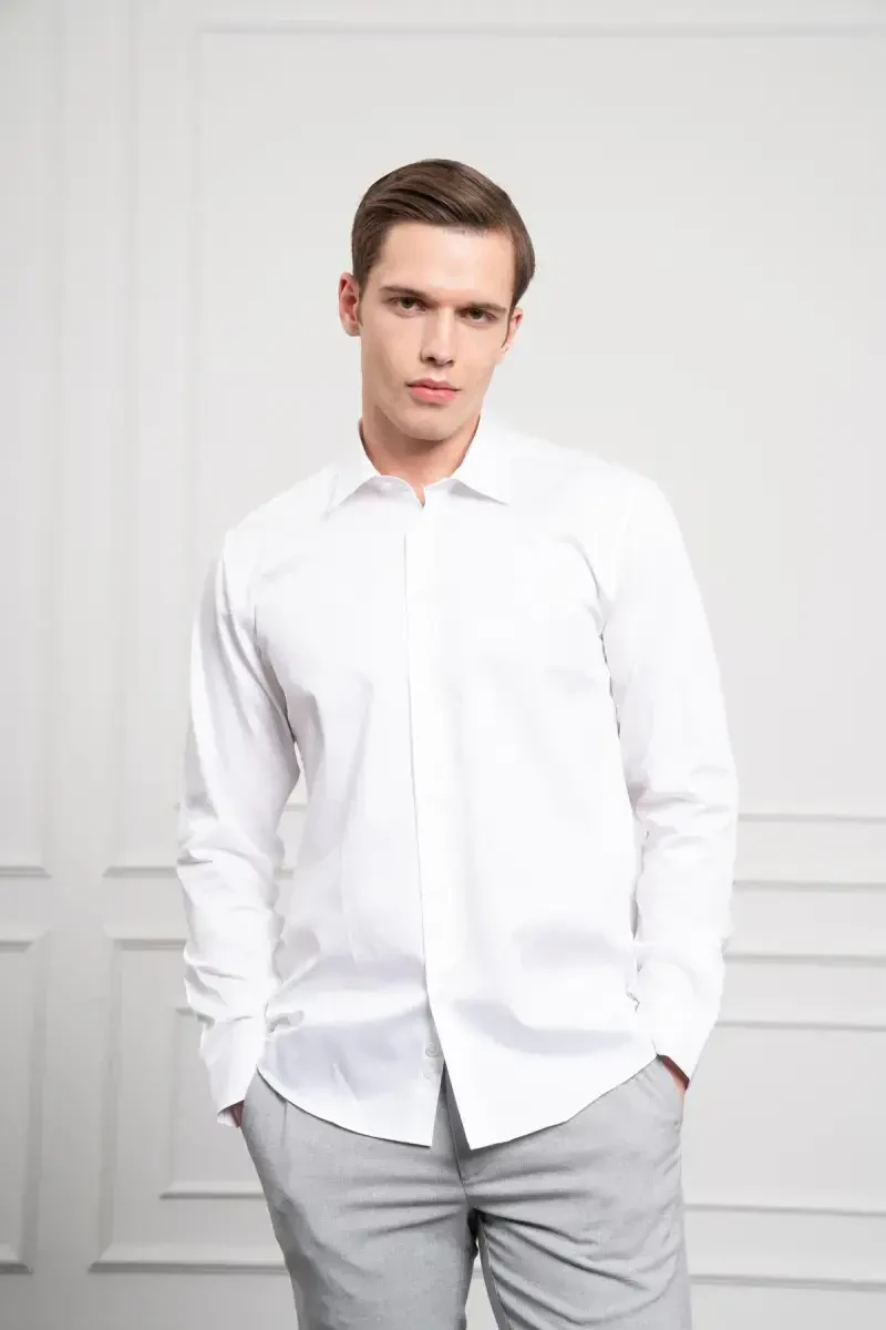 Erkek gömlek, beyaz gömlek, slim fit gömlek, pamuk gömlek, trend gömlek, dar kesim gömlek, ModaZon, şık gömlek, modern gömlek, uzun ömürlü gömlek