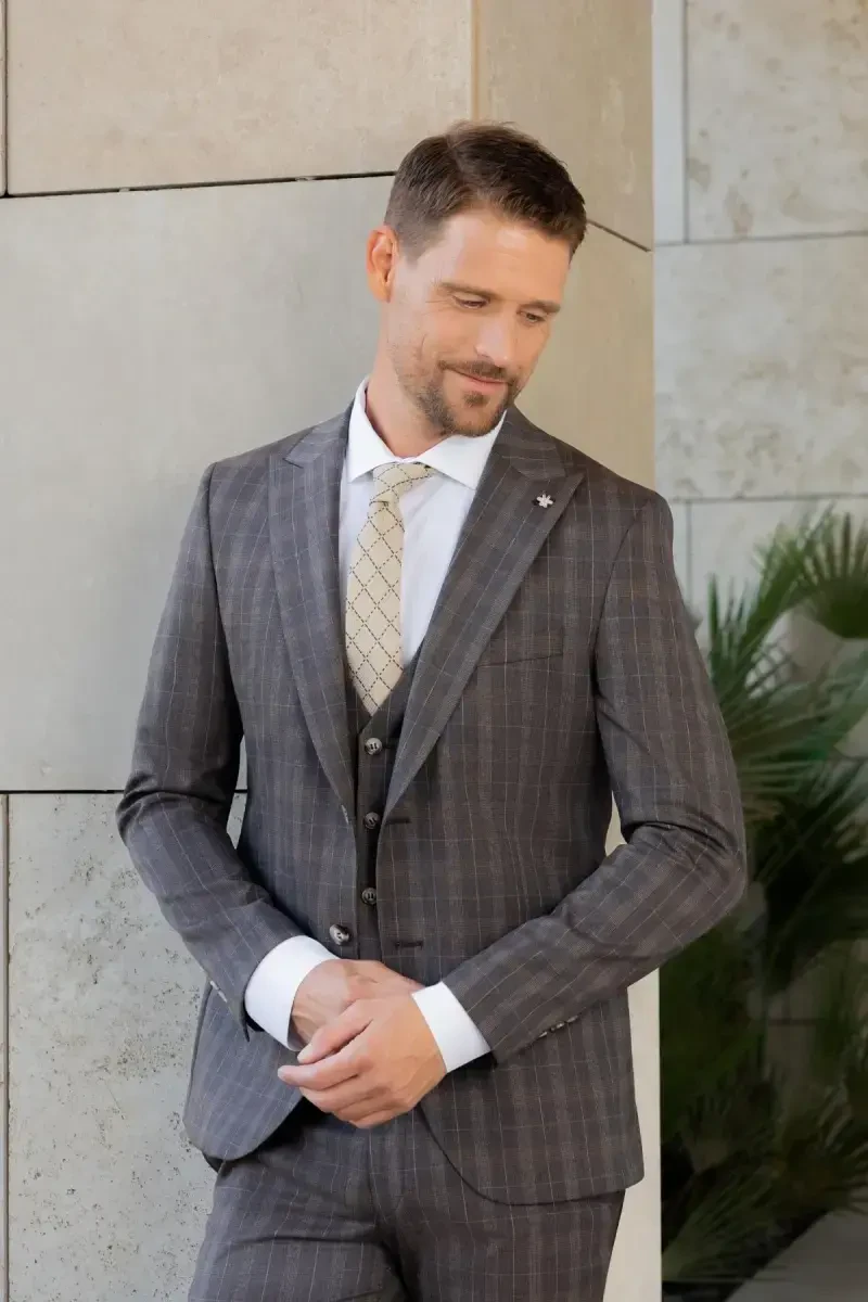 Men's suit, slim fit, with vest, plaid, brown, polyviscose, peak lapel, trendy, fashionable, stylish