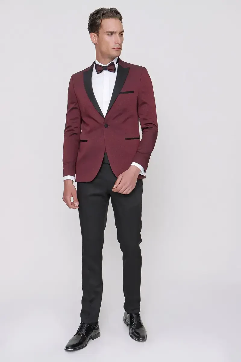 смокинг, бабочка, кушак, платок, бутоньерка, облегающий крой, бордовый, с таёжным узором, Ceromonia, мужская одежда