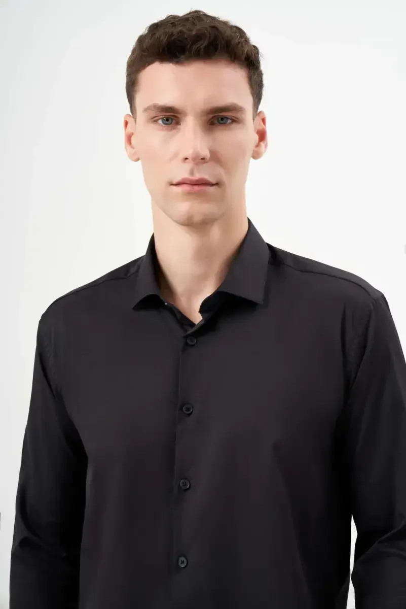 Erkek gömlek, siyah gömlek, slim fit gömlek, İtalyan yaka gömlek, basic gömlek, düz desen gömlek, pamuklu gömlek, modazone gömlek, uzun kollu gömlek, şık gömlek