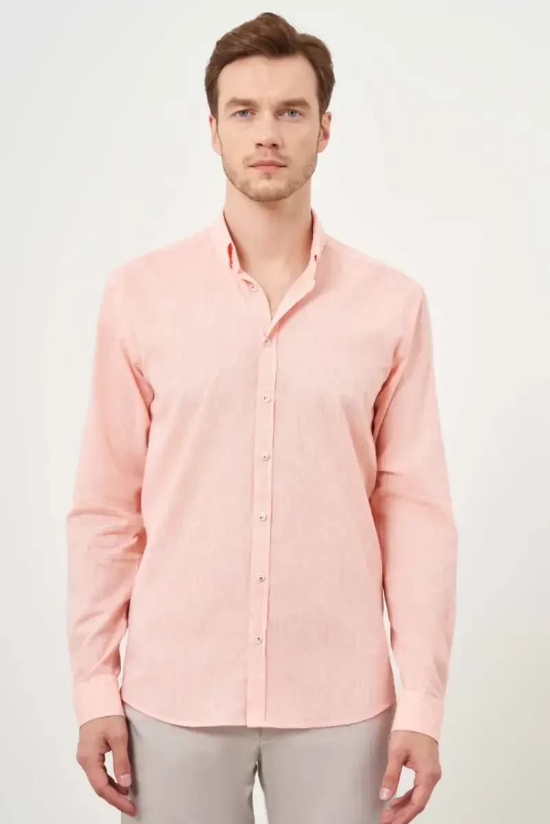 erkek gömlek, turuncu keten, slim fit gömlek, düğmeli yaka, düz desen, moda, günlük giyim, şık gömlek, yazlık gömlek, keten gömlek