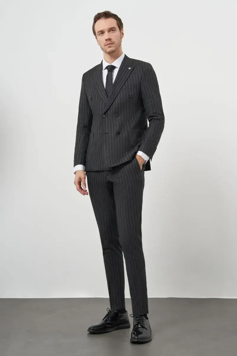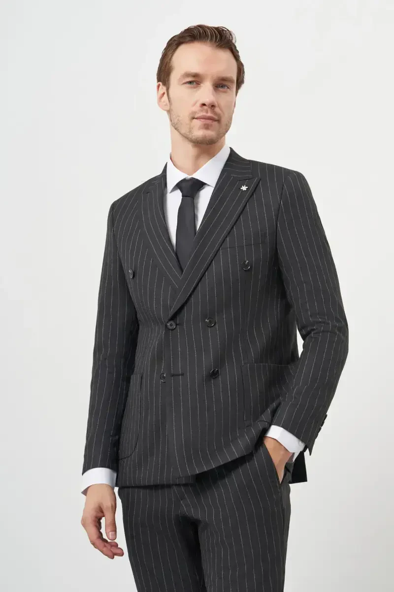 Men's suit, charcoal suit, double-breasted suit, slim fit suit, peak lapel, polyviscose suit, trendy suit, men's fashion, Modazone, men's clothing