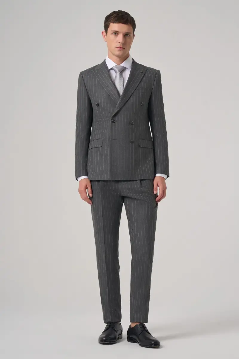 ModaZon Men's Smoke Gray Polyviscose Trend Striped Slim Fit Double Breasted Suit is the stylish choice of the modern man. If you want to make a professional impression in business life or dazzle with your elegance on special occasions, this suit is for you. Thanks to its slim fit cut, you get a fit look that hugs your body. The double-breasted model combines classic and modern lines, allowing you to stay up-to-date at all times. The smoky color can be easily combined with different shirts and ties, while the trendy striped pattern adds a dynamic touch to the suit. High-quality polyviscose fabric offers all-day comfort and convenience. Thanks to the breathability of the fabric, sweating is minimized, so you feel good even on busy days. The detailed workmanship of the jacket and trousers reveals the quality of the suit. The flawless stitching and model lines provide a perfect fit on you. The inner lining of the suit is also carefully selected and offers a soft touch to your skin. With the ModaZon Men's Smoke Gray Polyviscose Trend Striped Slim Fit Double Breasted Suit, you not only wear a suit, but also carry a style statement. This suit, which will increase your self-confidence both in business meetings and at special events, will be one of the most valuable pieces in your wardrobe. Always be one step ahead with this suit that offers elegance, comfort and quality together. Remember, your clothing style is a reflection of your personality and you can best express your style with ModaZon. You can complete this suit with different models and accessories to create your own unique style. Whether you combine it with a classic shirt and tie, or a more modern t-shirt and sneakers, you will not compromise on your elegance in any case. This suit, produced with ModaZon quality, will maintain its place in your wardrobe for many years and will always offer you a stylish and confident look. Choose the ModaZon Men's Smoke Gray Polyviscose Trend Striped Slim Fit Double Breasted Suit to feel special and reflect your style in the best way.
