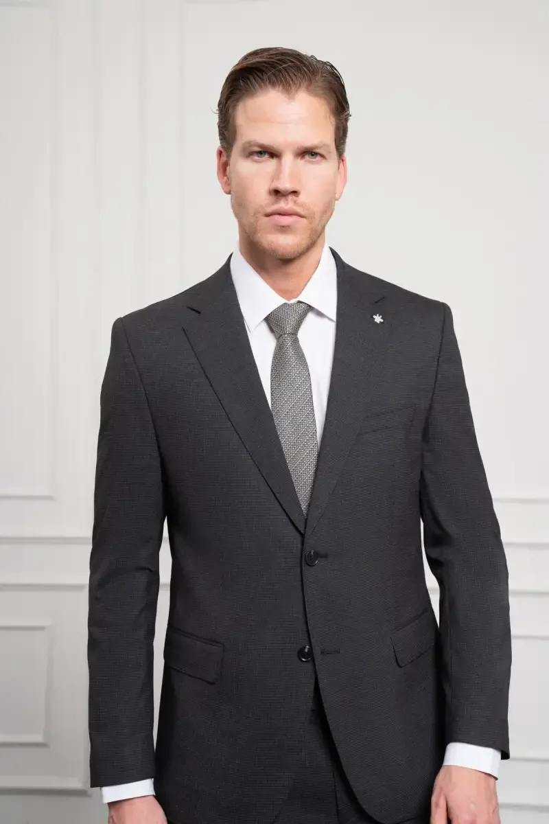 Elevate your style with the Modazone Men's Anthracite Trend Wool Dynamic Fit Relaxed Fit Mono Collar Suit. This suit is a timeless piece that should be in every modern man's wardrobe. The anthracite color offers a sophisticated and versatile look, while the wool blend fabric keeps you warm in cold weather. The Dynamic Fit cut creates a stylish and comfortable silhouette, so you don't compromise on comfort all day long. The mono collar design adds a modern and minimalist touch to the suit, making it easy to combine with various shirts and ties. The fully lined construction ensures that the suit fits you perfectly and is long-lasting. The single vent detail increases your freedom of movement, while the flap and welt pocket details offer practicality. The buttoned design adds a classic touch, while the patterned fabric adds a different dimension to the suit. The Modazone Men's Anthracite Suit allows you to show off your elegance in any environment, from business meetings to special invitations. This suit from the Autumn-Winter collection is the ideal way to be stylish in cold weather. Feel confident and stylish anytime, anywhere with this suit that offers style and comfort together.