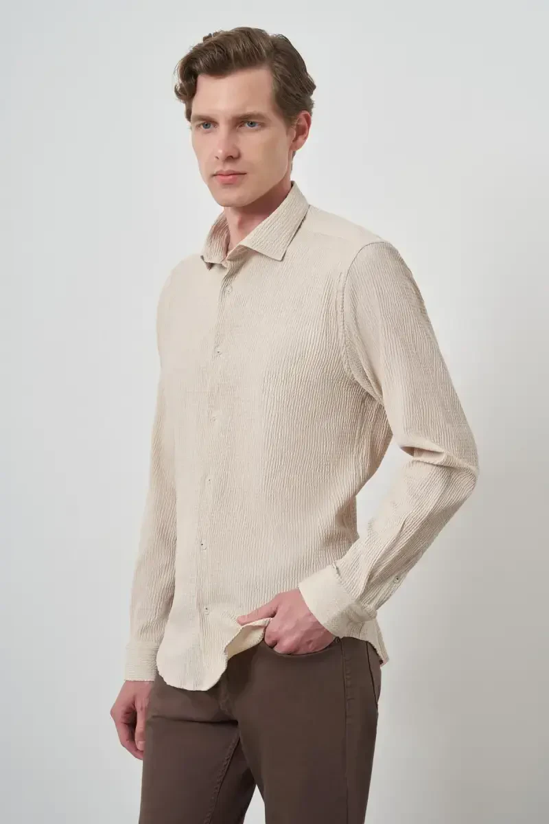 Men's Beige Waffle Shirt | Trend Patterned, Dynamic Fit, Italian Collar - Modazone