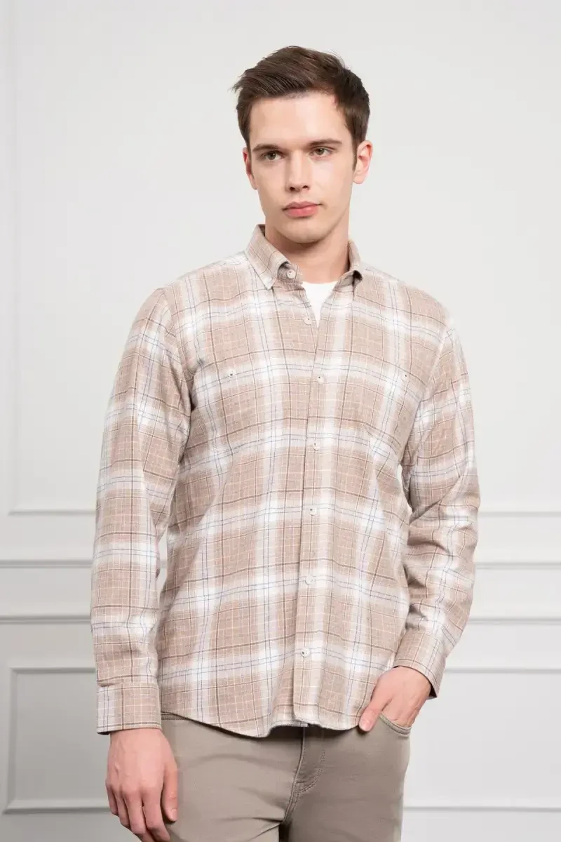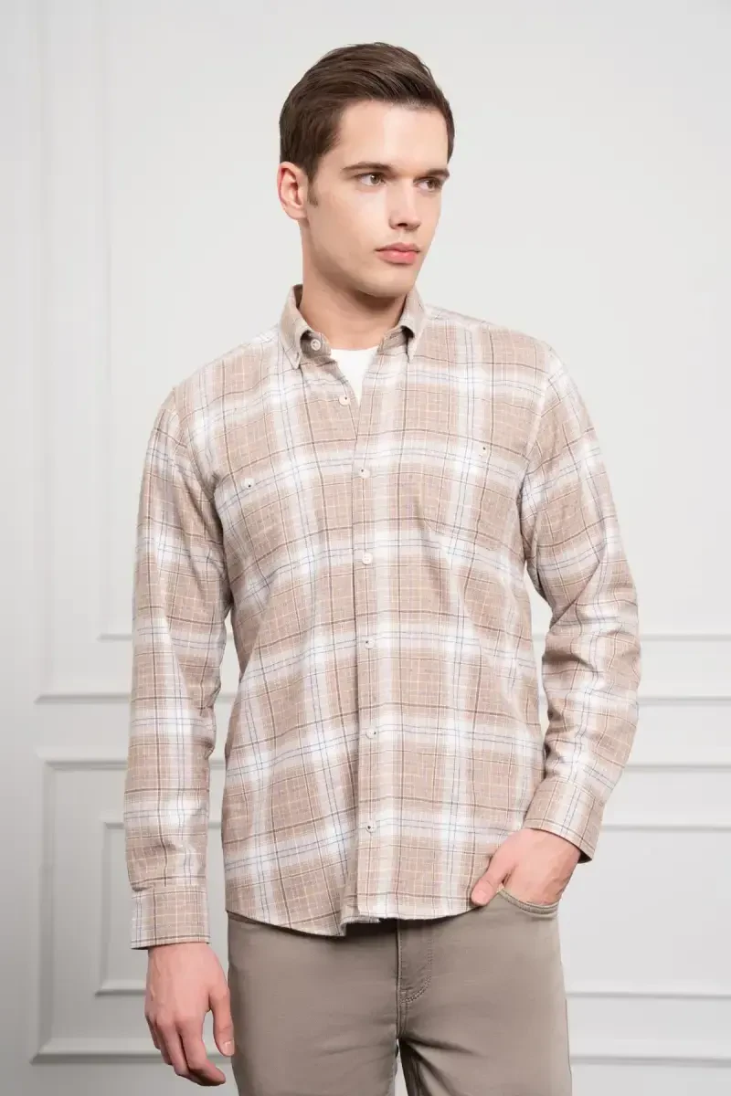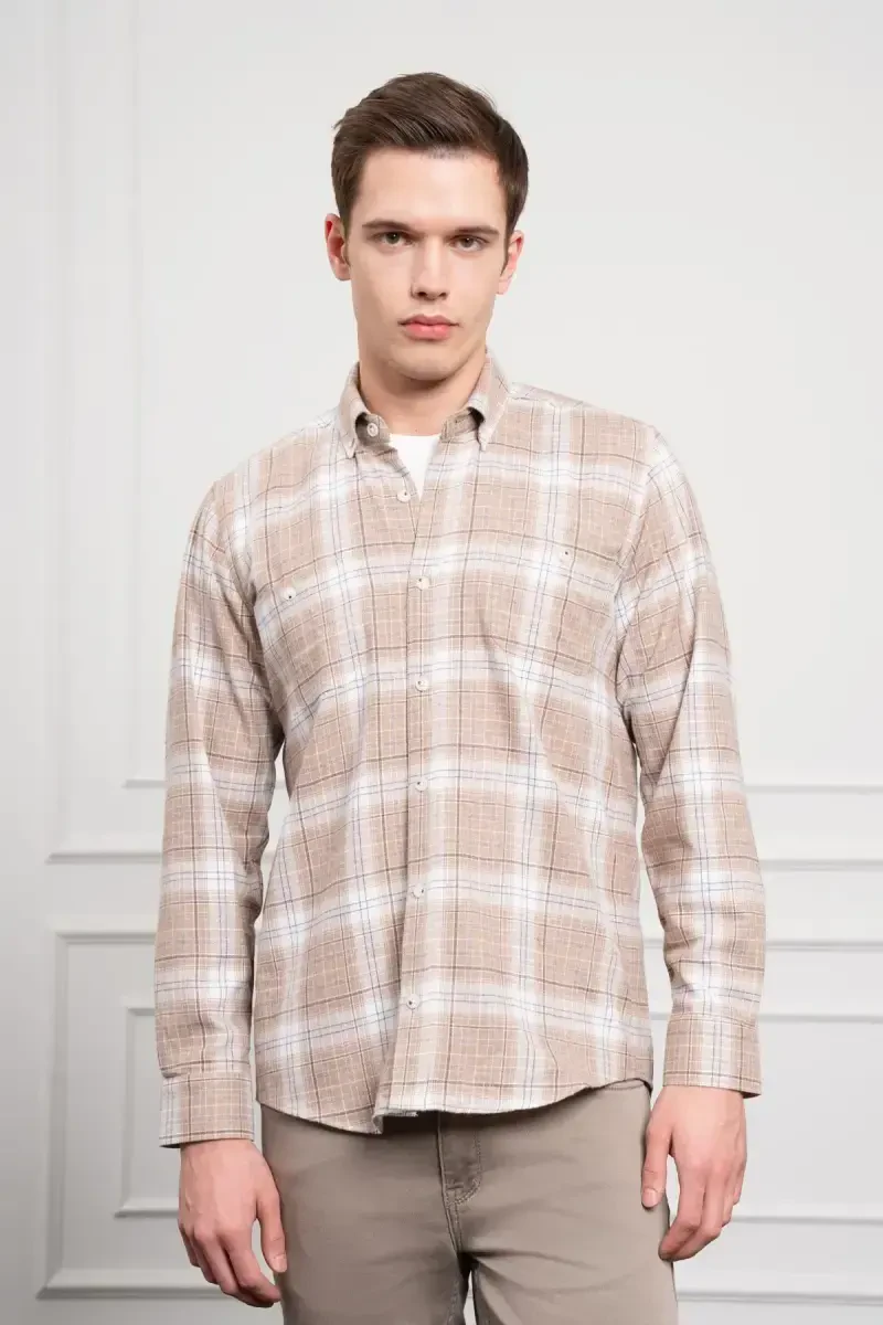 Model Measurements: Height: 1.88 cm, Chest: 98 cm, Waist: 75 cm, Hips: 99 cm. Model's size: M. 65% Cotton 35% Polyester. Button-Down Collar, Long Sleeve, Regular Fit. Suitable for Autumn-Winter season. Colors may vary due to light differences in studio shooting.