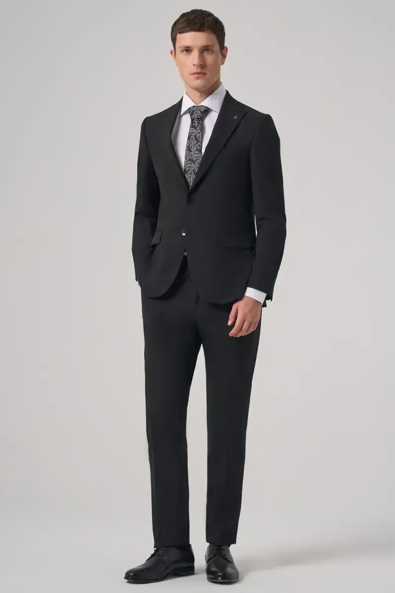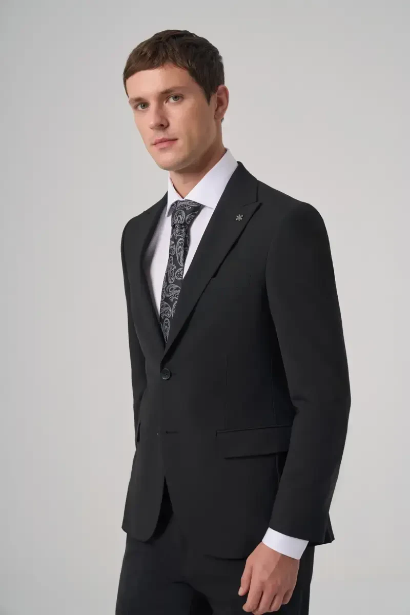 Men's suit, slim fit, black suit, polyviscose, peak lapel, fashion, stylish, comfortable, invitation, business life