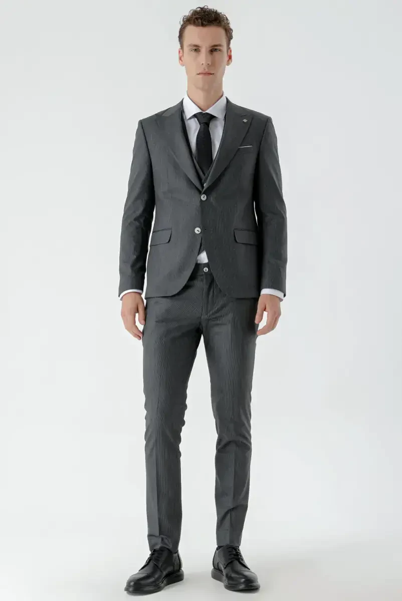 Suit, vest suit, patterned suit, slim fit suit, black suit, polyviscose suit, viscose suit, autumn-winter suit, peak lapel suit, men's suit