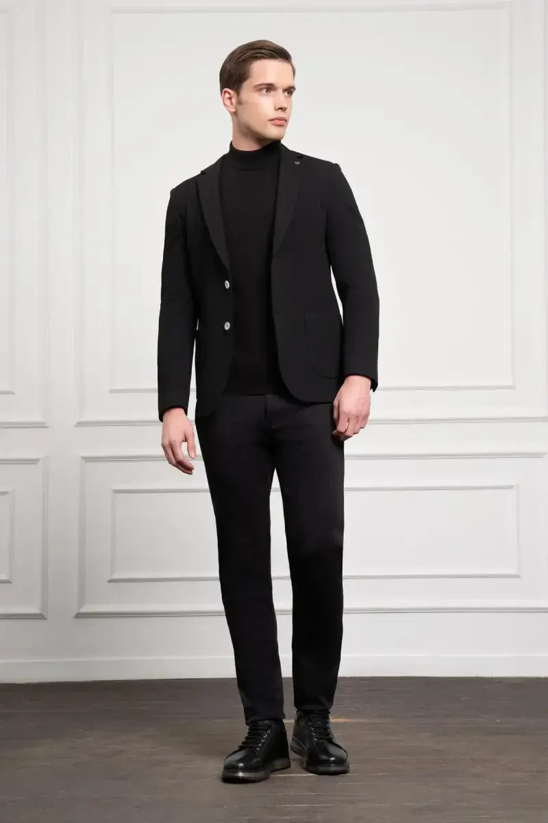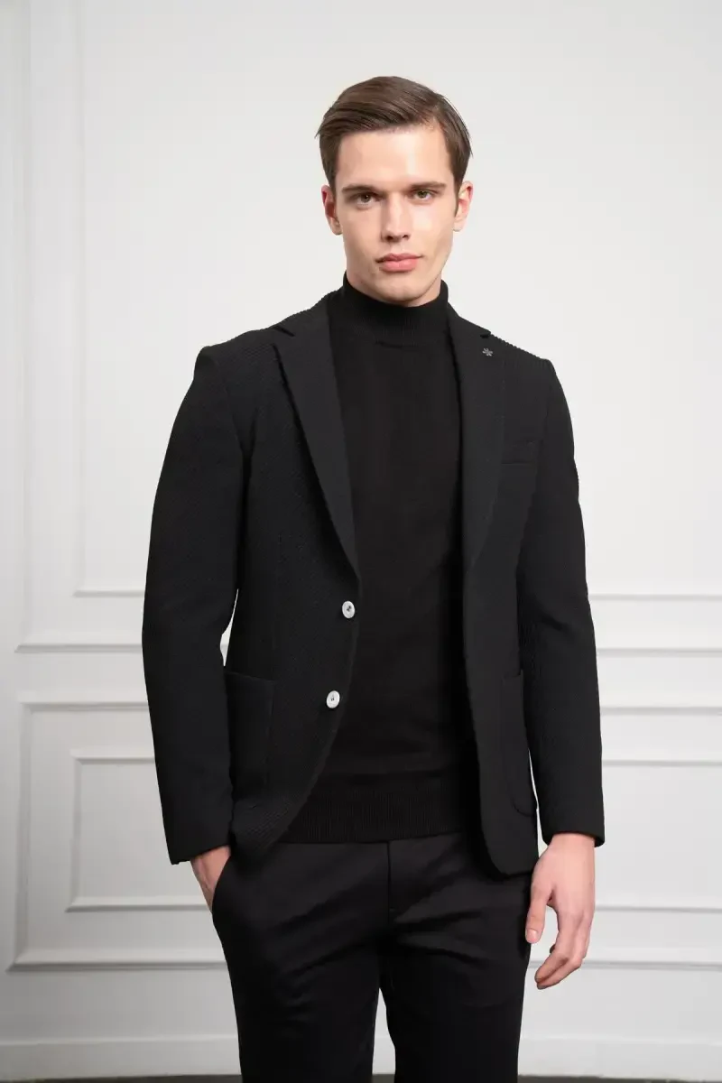 Men's jacket, slim fit jacket, black jacket, polyviscose jacket, woven pattern jacket, mono collar jacket, slim fit jacket, men's clothing, fashion jacket, stylish jacket