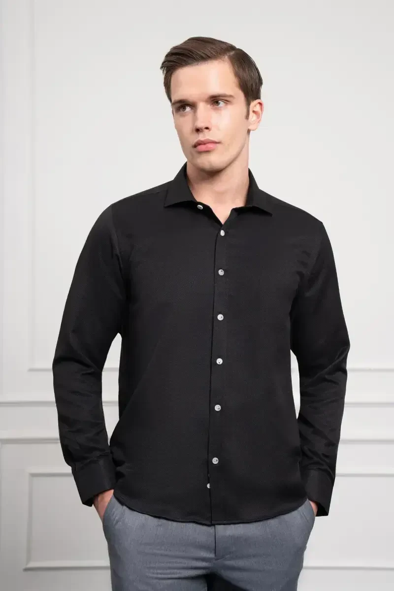 ModaZOne Men's Black Trend Italian Collar Slim Fit Narrow Cut Shirt is a stylish and elegant option that reflects the style of the modern man. This shirt attracts attention with its special Italian collar design, while its slim fit cut offers a fit look with its body-hugging structure. The noble and timeless tone of black is compatible with all kinds of combinations and can be easily preferred for both daily use and special occasions. Thanks to its quality fabric, it offers a comfortable use experience throughout the day. The narrow cut of the shirt creates a more dynamic and modern silhouette by emphasizing the body lines. The Italian collar adds a different touch to classic shirts, allowing you to achieve a stylish look when using a tie or bow tie. This shirt, produced with ModaZOne quality, is carefully designed for long-lasting use. The texture of the fabric allows your skin to breathe, preventing sweating and keeping you fresh all day long. Black color is suitable for use in all seasons and environments, and can be easily combined with trousers, jackets and accessories in different colors and patterns. This shirt, where you can maintain your elegance at all times, from business meetings to dinners, from special days to weekend trips, will be one of the indispensable pieces of your wardrobe. Stitching details and button quality complete the elegance of the shirt and offer long-term use. The cut of the shirt fits perfectly on you without restricting your freedom of movement and ensures that you always look well-groomed and stylish. Take your style one step further with the ModaZOne Men's Black Trend Italian Collar Slim Fit Narrow Cut Shirt and attract attention in every environment.
