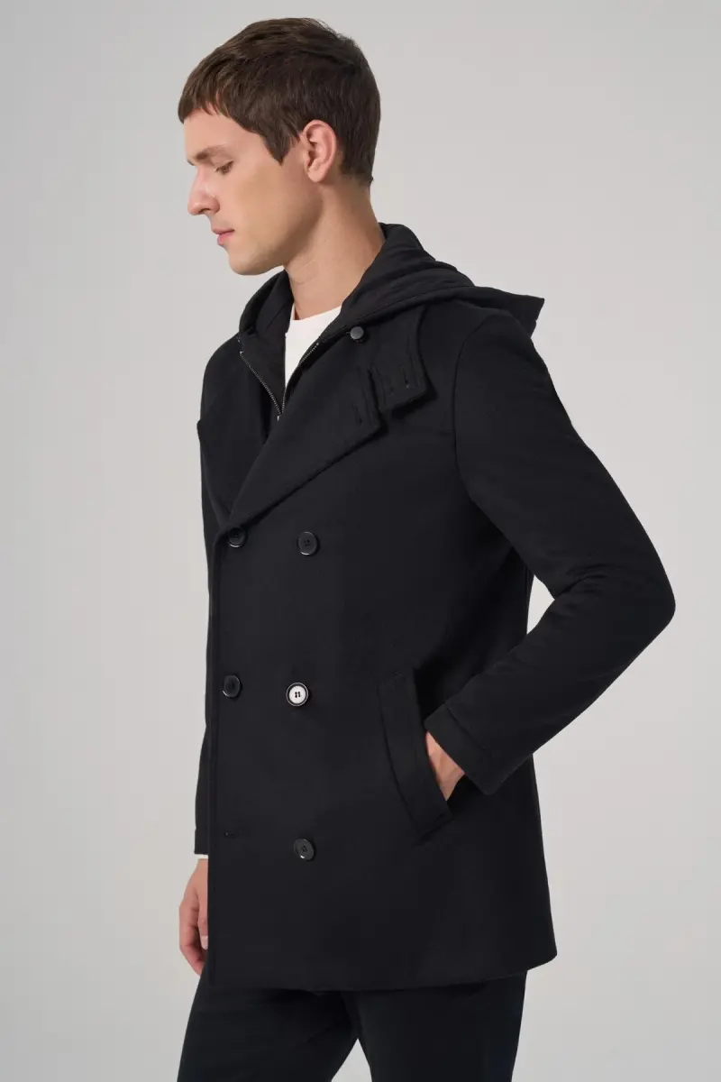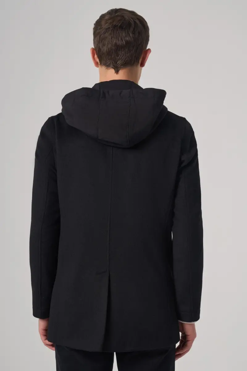 Brave the cold weather with the Modazone Men's Black Wool Removable Collar Hooded Dynamic Fit Coat! This specially designed coat, which combines elegance and comfort, is a candidate to be an indispensable part of your wardrobe. Thanks to its Dynamic Fit cut, it fits your body perfectly while not restricting your freedom of movement. It offers comfort all day long with its relaxed fit. Its quality woolen fabric protects you from the cold while giving you a stylish look. The removable hood feature allows you to adapt to different weather conditions and styles. You can easily change your style by using it with or without a hood. The button and zipper closure detail offers both safe use and completes the elegance of the coat. Thanks to its functional pockets, you can safely carry your phone, keys and other personal belongings. This coat, which provides extra comfort thanks to its inner lining, keeps you warm in autumn and winter. Its black color complements your style by matching with any combination. This coat, which you can easily choose for both daily use and special occasions, allows you to experience comfort without sacrificing your elegance. This coat, produced in Turkey with Modazone quality, is carefully designed for long-lasting use. Model measurements: Height: 1.88, Bust: 98, Waist: 75, Hips: 99. The model is wearing size M. Colors may vary in studio shots. Discover this coat that will be the star of your wardrobe now and make your style speak in cold weather!