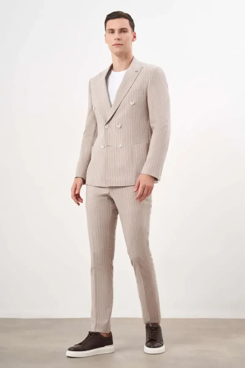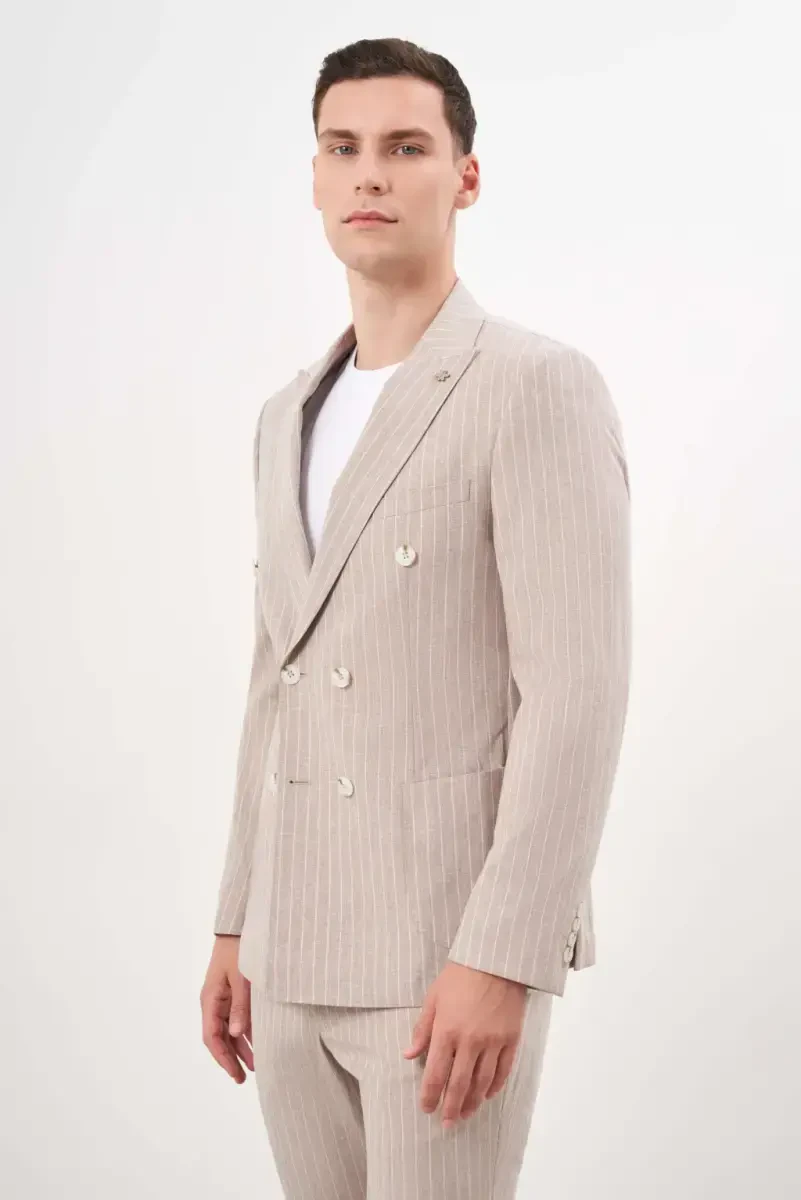 Men's suit, double-breasted suit, slim fit suit, linen suit, brown suit, peak lapel suit, trending suit, men's clothing, fashion, Modazone