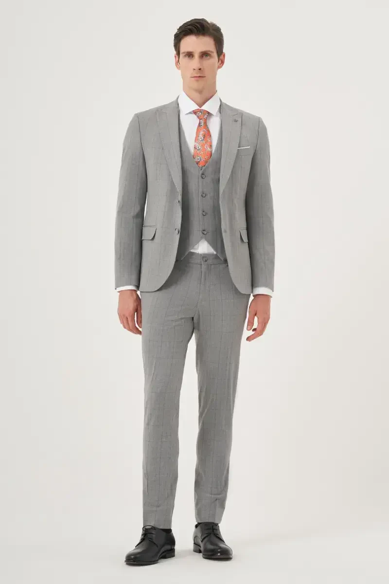 Men's Grey Plaid Vest Slim Fit Suit | ModaZon Elegance